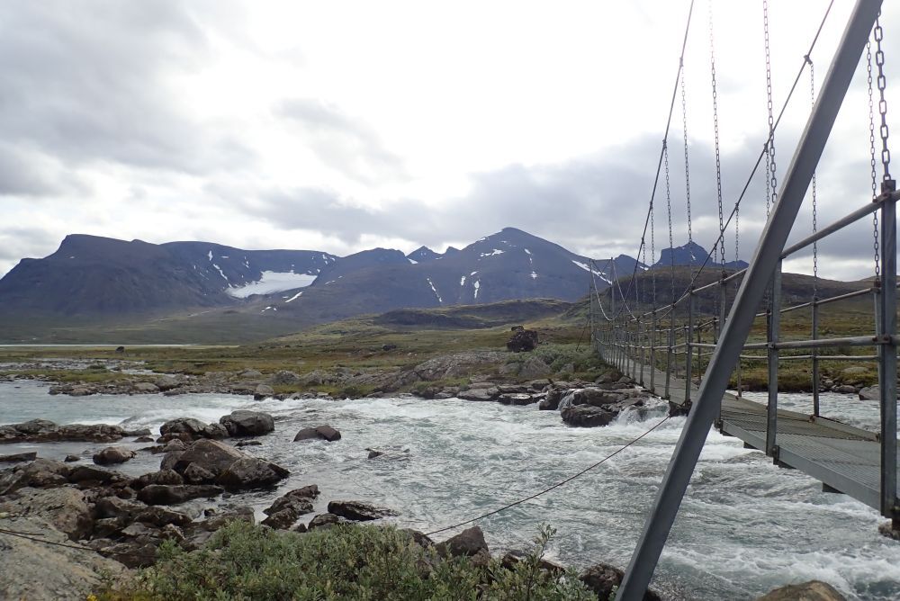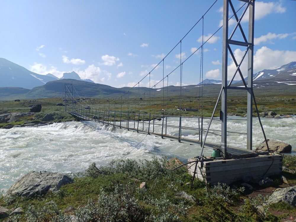 Når sedan bron över den upprörda Guhkesvakkjåhkå. Bilderna från arkivet bekräftar det jag känner på plats – det är mycket mer vatten i jokken nu än för nästan exakt fyra år sedan. Jag ska fortsätta en bit upp på sluttningen i riktning mot toppen, slå läger och luncha där.