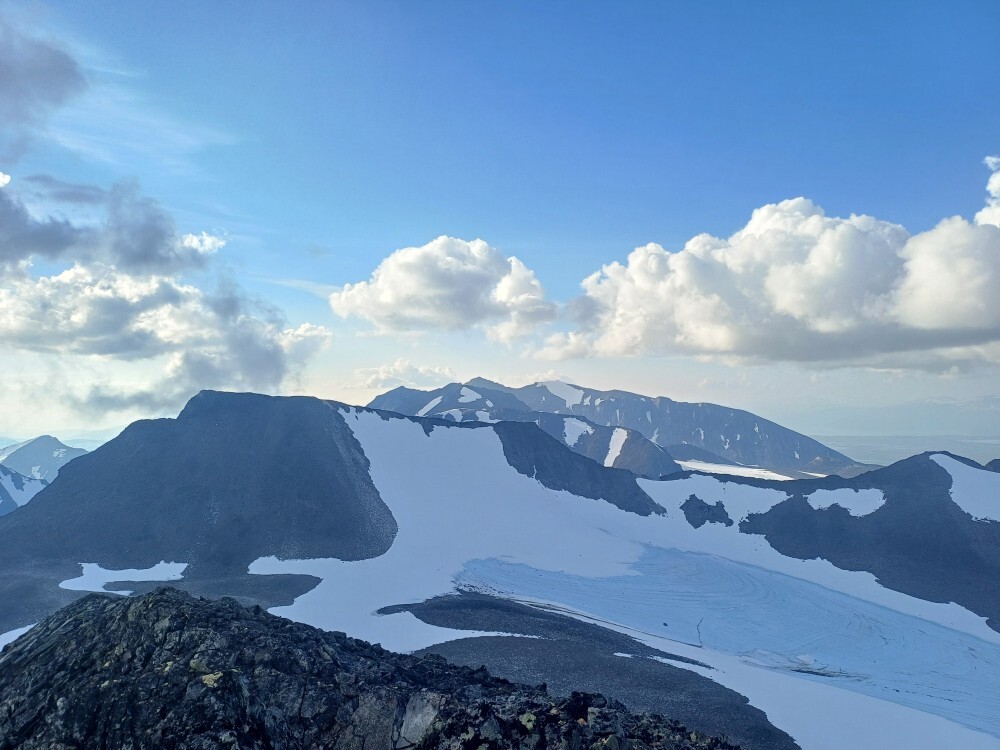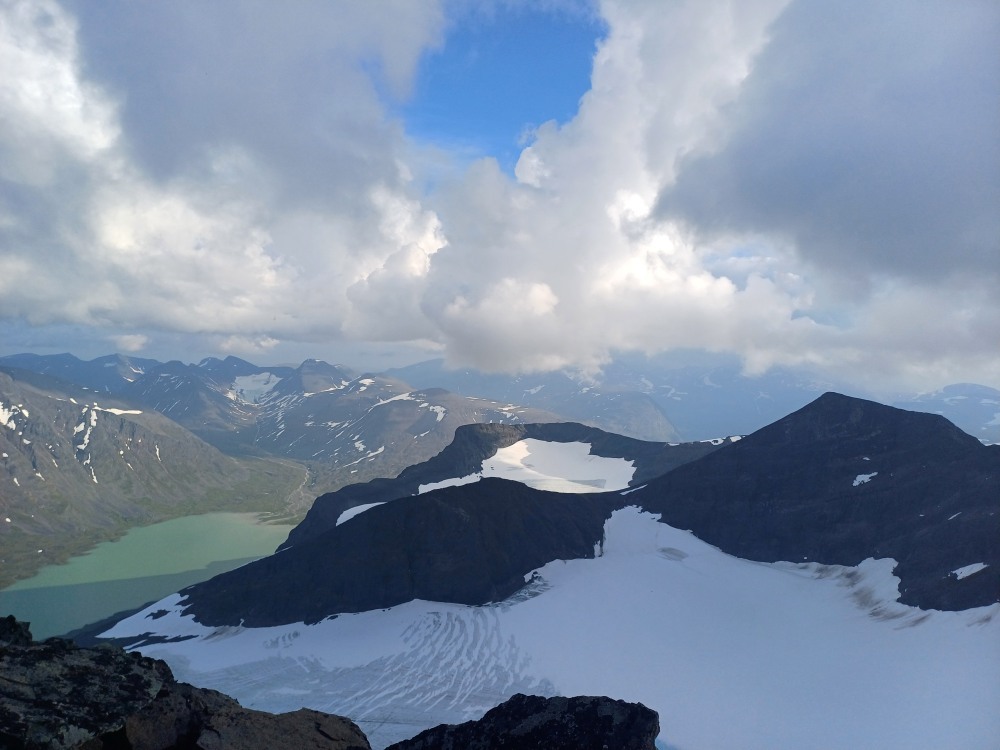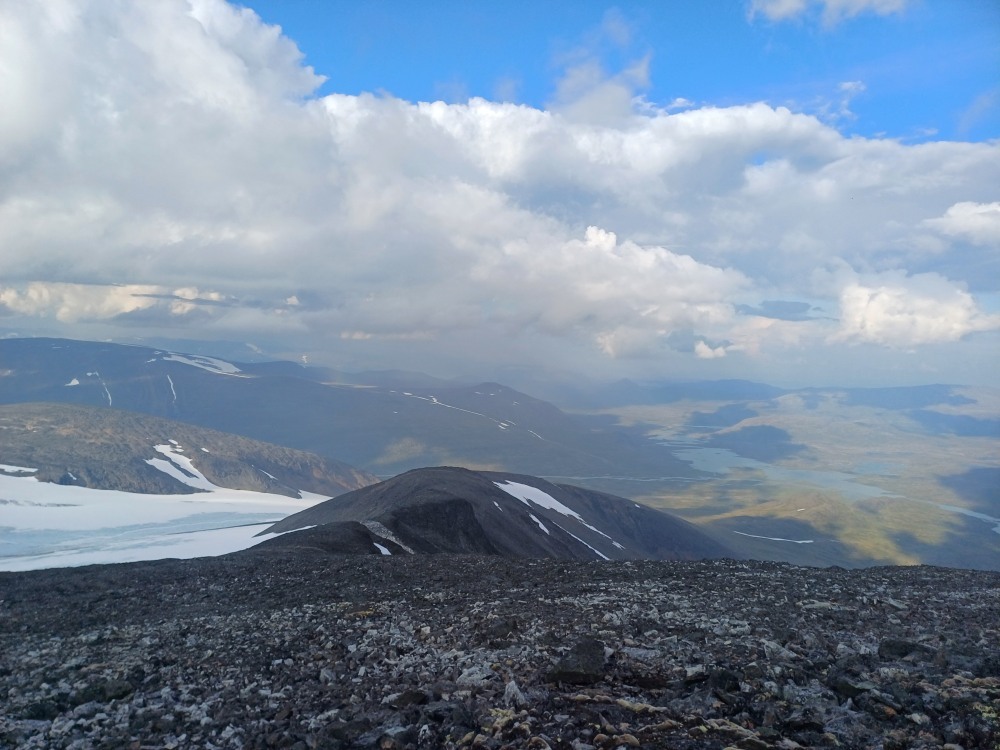 Vid halv sju når jag toppen, helt enligt beräkningarna. Roligt att åtminstone kunna se alla Sarektjåhkkås toppar på rad, då jag knappast lär komma upp på någon av dem den här gången. Fotar och filmar ett panorama med den vidunderliga utsikten. Sitter och vilar mig en stund och först efter en halvtimme påbörjas nedfärden.