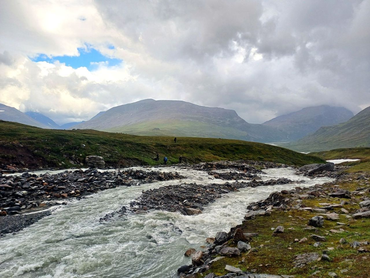 Jag möter flera grupper som vittnar om tuffa tag. Ett par damer har också tvingats vända i Bastavagge, ditlurade av en proffsguide som tvärsäkert givit grönt ljus för passage. Samt ett grabbgäng som kommit delvis samma väg som jag planerat, fast i motsatt riktning – de hade börjat i Staloluokta och gått österut. De hindrades av Gajnajjågåsj, ett vattendrag i västra Sarek som jag tänkt passera, och fick gå flera kilometer uppströms och hundratals höjdmeter innan de kunde ta sig över.