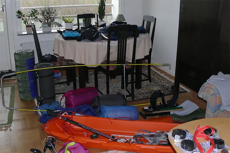 Men det ska erkännas att det känns ovant med vintertur. Här i Skåne har de senaste vintrarna varit snöfattiga. Skidor och pulka har samlat damm i källaren och det mesta av vinterutrustningen har legat oanvänd. Men nu är alltihop framplockat igen. I vardagsrummat samlar sig högar av kläder, sovsäckar, mat och packpåsar.
