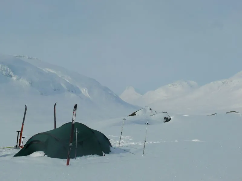 Det har det även blivit ett antal vinterturer på skidor i fjällvärlden. Att vistas en hel vecka (eller mer) i tält bland de snöklädda fjällen är en annorlunda och fascinerande upplevelse. Men jag och min kompis Anders tycktes ha en märklig förmåga att hamna i snöstorm och oväder!