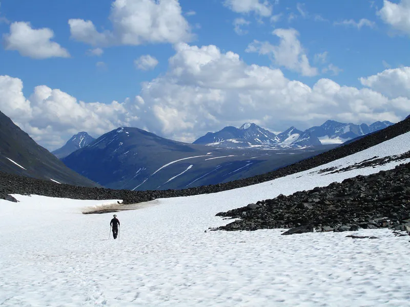 Det hade blivit torsdagen den 7 juli, och vi kröp ut tältet på vår lägerkulle invid Álggajåhkå. Vädret var en blandning av moln och sol, det var varmt. Vi tog det lugnt och förberedde oss för den dagstur vi skulle göra runt det massiv som innehåller bland annat Skájdetjåhkå och Sarvestjåhkå. En lätt packning med regnkläder och lunchmat samlades ihop, och så lämnade vi vår lägerplats. Klockan var strax efter 12 på dagen.