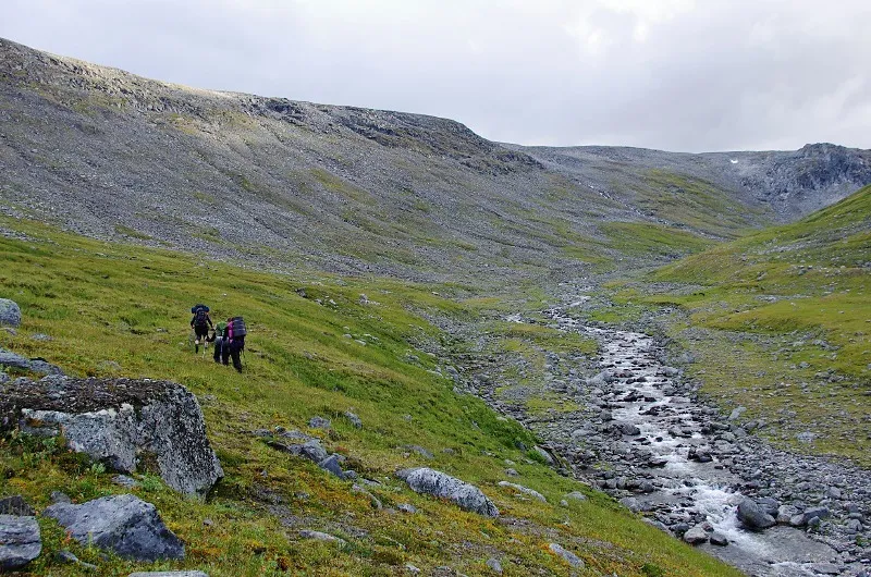 För att nå högplatån behövde vi gå genom dalgången Noajdevágge. Denna är också ganska egenartad med en uttalad S-form. Krökningen syns tydligt på fjällkartan, men jag upplever den som ännu tydligare i verkligheten. Dalen känns ganska avskild, som en egen liten värld. Den är djup med höga, branta bergssidor. Man kan tälta på fin gräshed på några ställen i dess nedre och mellersta delar, men i den övre delen är det stenigt och brant.
