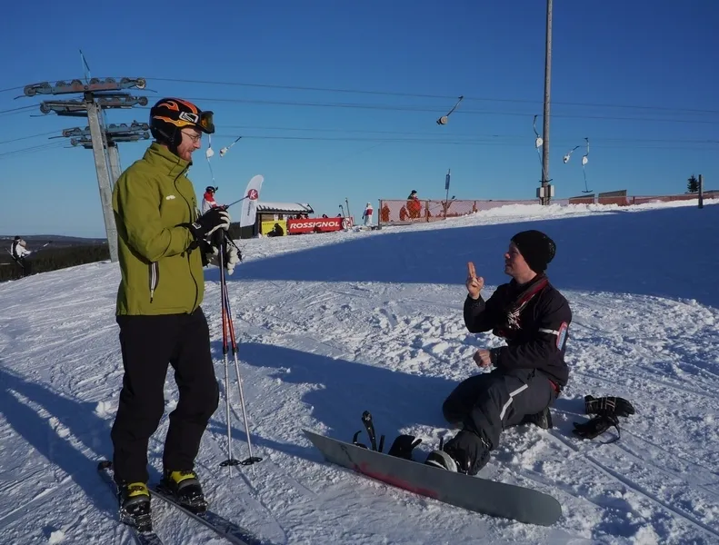 I lördags var jag och två kompisar ute och åkte skidor i Bygdsiljum . Jag åker telemark, min ena kompis snowboard och den andra slalom. Det var härligt väder med sol och blå himmel. Dessutom hade det snöat mycket på sistone så att alla backar var öppna. Att det var mycket snö gjorde ju upplevelsen och skidåkningen väldigt härlig!