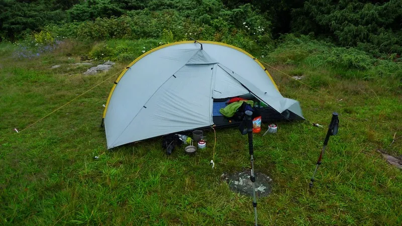 Inför den här turen visade väderprognosen att det skulle bli dåligt väder med rikligt regn, blåst och även risk för åska. Det passade mig perfekt tänkte jag. Anledningen är att jag vill blöttesta min utrustning. En del av utrustningen var ny. I slutet av våren hade jag fått hem ett nytt tält, Tarptent Double Rainbow, som är tänkt att fungera som både solo- och tvåmanstält. Men ett sådant tält kräver att man själv sömtäter det. Sömmarna är alltså inte täta och man får själv göra det. Ett sätt att hålla kostnaden lägre samt kunna producera tält många som möjligt. Detta är vanligt bland små tillverkare (cottage industry).