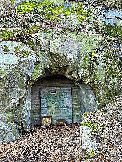 Igenmurad dörr vid bergets fot. Åsen var under det kalla kriget en viktig luftförsvarsanläggning. Det sägs att bergknallen skulle motstå kärnvapen. Numera en viktig biotop för ökad ädellövskog och bevarande av gamla ruttna trädstammar, berättar Länsstyrelsen. En hemlig värld av insekter, mossor och lavar. Naturen ska bli återfuktad vilket innebär att stigarna är tämligen vattensjuka.