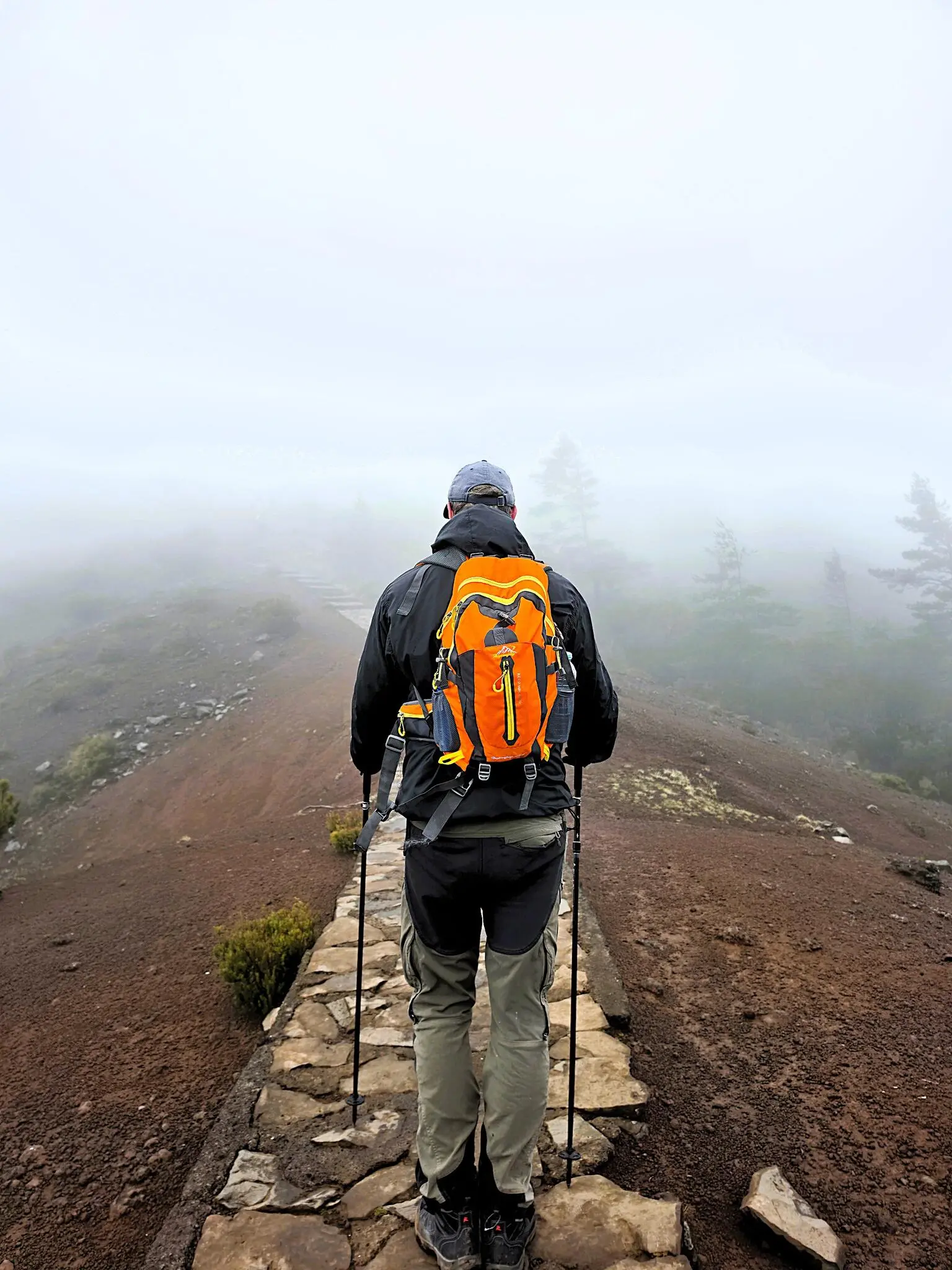 Ribeira Da Chanela, på nordvästra sidan av ön. Havets krafter har skapat vassa klippformationer. Uppe i bergen ligger dimman tät som i en skräckfilm. Det är både halt och kallt. Stavar anbefalles.