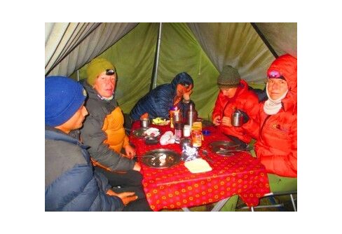 Jag väcks inte för jag har redan legat vaken i tältet sen 02.00 och tänk på dagen. Så kommer det; Good morning, namaste. Min tältkompis för natten ...
