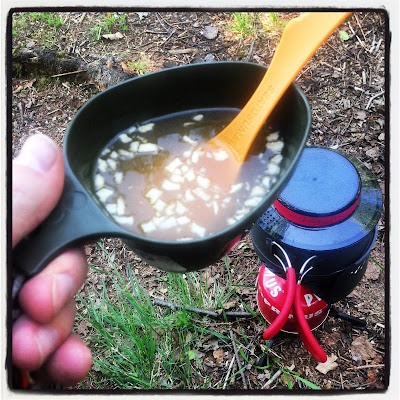 När jag kom fram till min tänkta rastplats vid Stora Hästevatten hade jag nästan avverkat 20 km och klockan var strax efter 19:00. Här fanns en "fast" lägereldsplats och till och med ett par soptunnor. Jag satte mig vid sjön, fräste upp lite korv, blandade i ravioli och parmesan och njöt av ensamheten i naturen. Började fundera på om det fanns en risk att sommarystra ungdomar skulle komma till platsen för att partaja men insåg att det var inget jag kunde göra något åt. Jag tvättade fötterna i sjön, satte upp tältet och packade ihop inför natten. Liggunderlaget från Exped blåstes upp med hjälp av påsen men av någon anledning fick jag för mig att lägga det med huvudändan åt vänster sett från öppningen. Det har ju ingen principiell betydelse som sådant, men då det är den högra delen som öppnas blir helt enkelt i- och urklivande lite mer bökigt så som jag gjorde det. Man lär sig hela tiden.