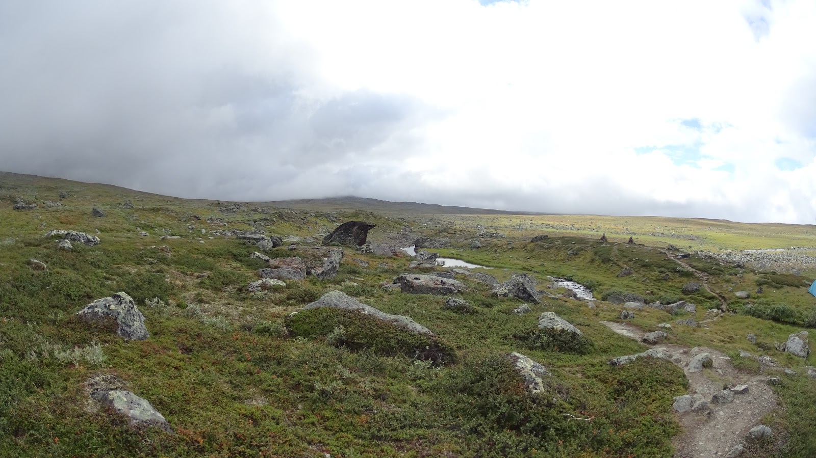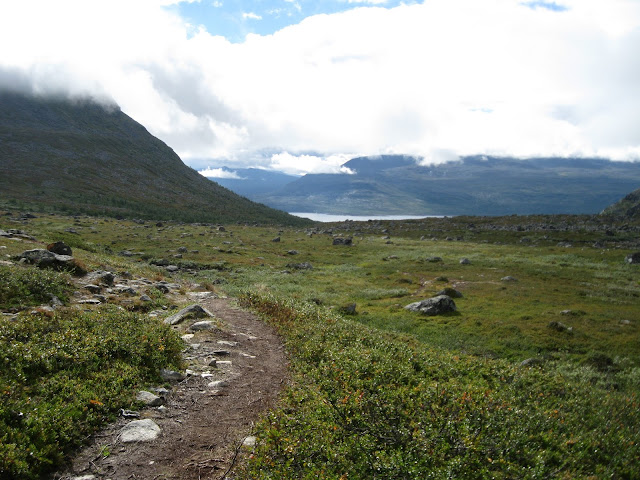 Det började med en lång seg uppförsbacke som bitvis blev insluten i lågt drivande moln. Då sjönk temperaturen betydligt och underställ under långbyxor kändes som ett klokt val. Väl uppe blev lönen för mödan ett vidöppet kalfjäll med milsvid sikt. Böljande fjällsidor med fler renflockar, stenpartier med porlande jokkar och ett molnskådespel i olika gråa nyanser som var ständigt skiftande. Ibland blev Sarek-fjällen synliga och rätt som det var sprack det upp och sjön i Stora Sjöfallet låg framför ens fötter.
