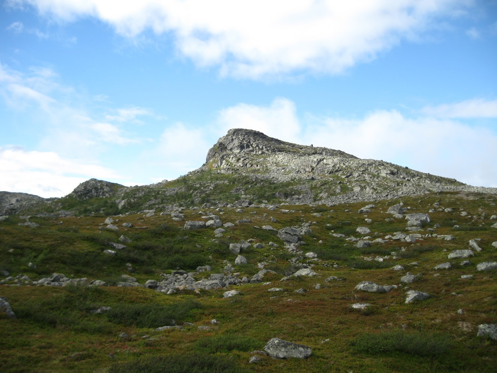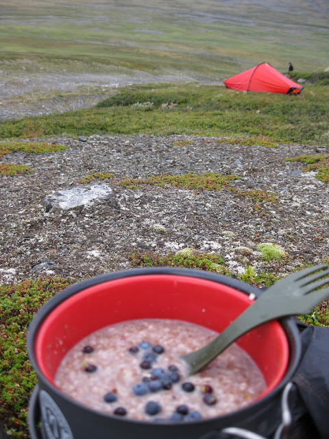 Det kom några skurar under natten (den första bara minuter efter att jag krupit in i tältet) men vad gör det om man har ett bra tält? Det var också ganska kallt, fick dra upp dragkedjan på säcken hela vägen och sov med strumpor. Varför jag inte tog på mig mössan har jag ingen aning om. Var väl för trött helt enkelt. Vaknade vid 5, gick ut och pissade i den svala fjälluften, gick sedan tillbaka och somnade efter en stund om till runt 8. Börjar bli en hejare på att fixa havregrynsgröten nu och få mig en kopp kaffe samtidigt med minimal diskmängd. I morse kryddades det med en en handfull nyplockade blåbär och odon. Mina grannar gick upp ungefär samtidigt men de är lite snabbare i sina morgonbestyr och var iväg någon halvtimma före mig. Under packbestyren kom plötsligt en flock renar över bergskammen ner mot vårt läger. En bit bort, men ändå (sa sörlänningen).