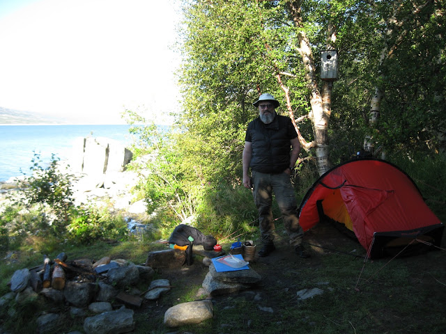Bussen mot Saltoluokta skulle gå 9:40 så 7 steg jag upp och gick ner på klipporna och gjorde min morgongymnastik. Helt OK vy, klar himmel och morgonsol på Akka-massivet. När jag var tillbaka och gjorde min frukost vaknade Stockholm och började genast vissla och sjunga inne i tältet. Vilken skön snubbe. Vi pratade lite, han skulle tydligen egentligen blivit tandläkare men på sydsluttningen av Akka 1969 blev han "bergtagen", åkte hem, skippade odontologin, sadlade om till botanist, naturvårdare och fotograf (även om bilderna han tog av mig blev rätt dåliga...). Nu verkade det som att han var pensionär, han hade ingen egentlig plan utan åkte dit han ville, dag för dag.