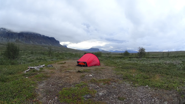 Väl framme i Saltoluokta (efter båtfärd) plockade jag ut min depå och packade om. Det blev en påslunch ute på gården, lite shopping av märke och nötter och sen bar det av. Skåningarna kom och sa hej och tio i två gav jag mig av. Jag gick i dryga två timmar (varav minst en var uppför) och sen slog jag rast. Jag hade tänkt att gå minst 9 km men det blev bara cirka sju. Rastplatsen var så bra att jag beslöt mig för att slå läger för natten. 19:50 kröp jag in i tältet, 20:05 kom regnet. Återstår att se hur väl jag valt plats.