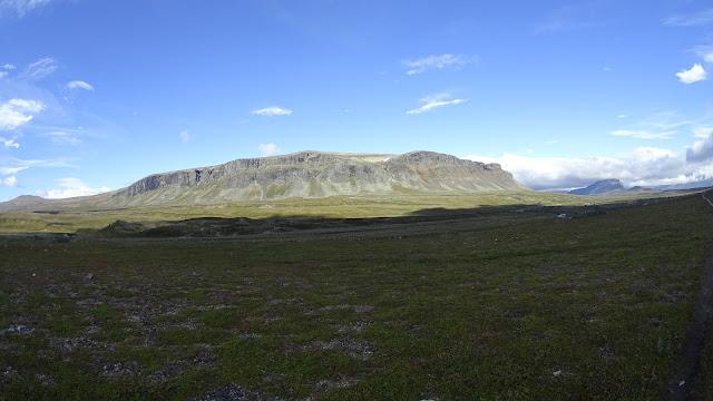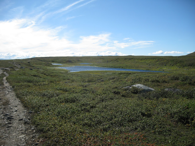 Jag kan förlika mig med de allra flesta av väder. Köld, regn, värmebölja, ruskväder. Blåst däremot, det kan jag inte förlika mig med. Man kan ju liksom inte gör något åt det. Visst, en vindtät jacka hjälper men vinden tar likväl tag i allt. Hugger och rycker, jagar och drar. Natten var regnig och blåsig och när det var morgon var bara blåsten kvar. Men det var den med besked. Ingen idé att sitta, ingen idé att ha hatt. Den enda fördelen var att tältet gavs en chans att torka. Skyarna jagade kapp med varandra över fjället och det var omöjligt att veta om det skulle regna eller klarna upp. Jag gav mig iväg strax före 9 och knatade söderut. Nordöstanvinden högg tag bakifrån och det var riktigt skönt att gå åt det hållet jag var på väg. De jag mötte såg pinade ut med huvor och vantar.