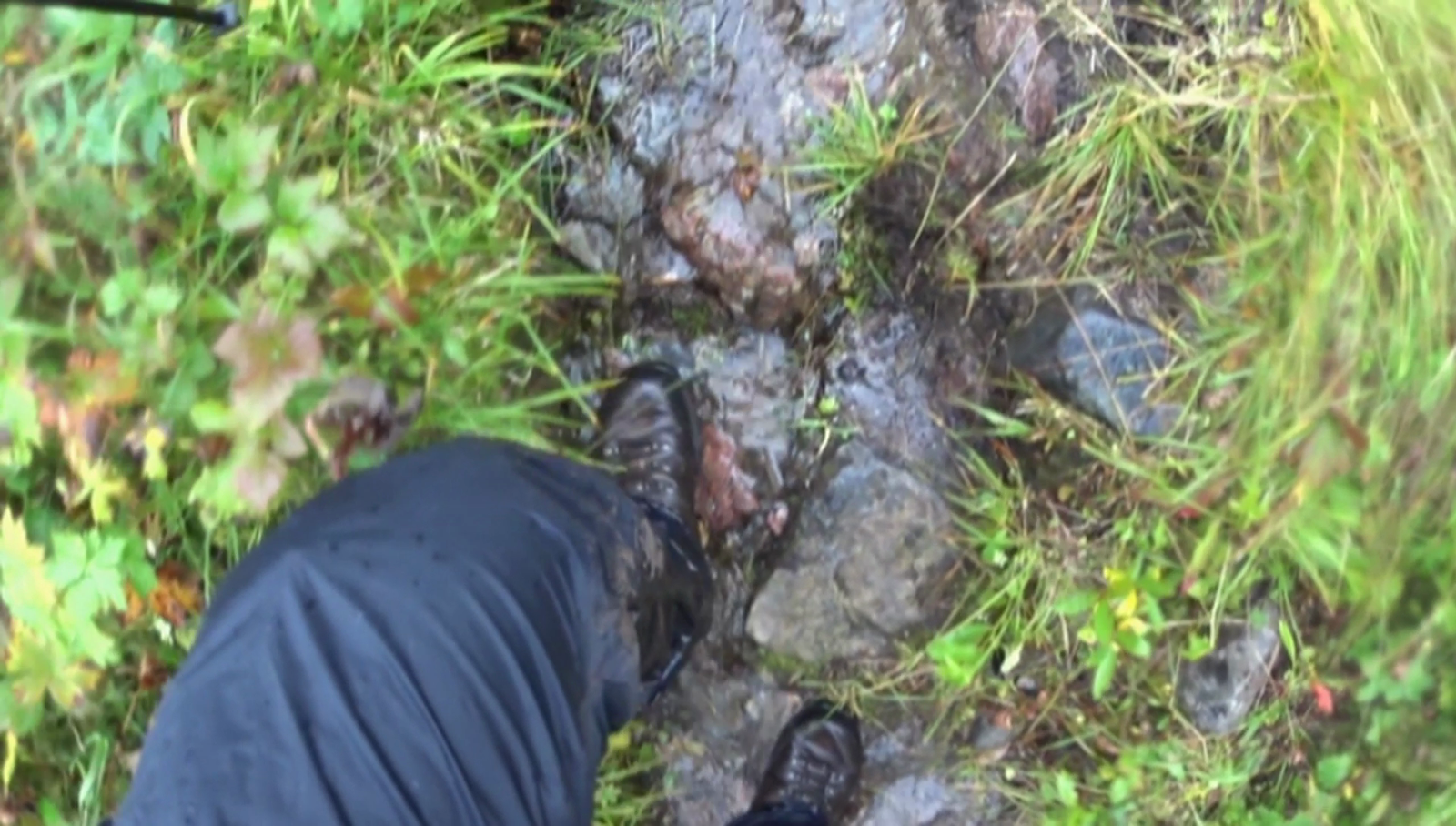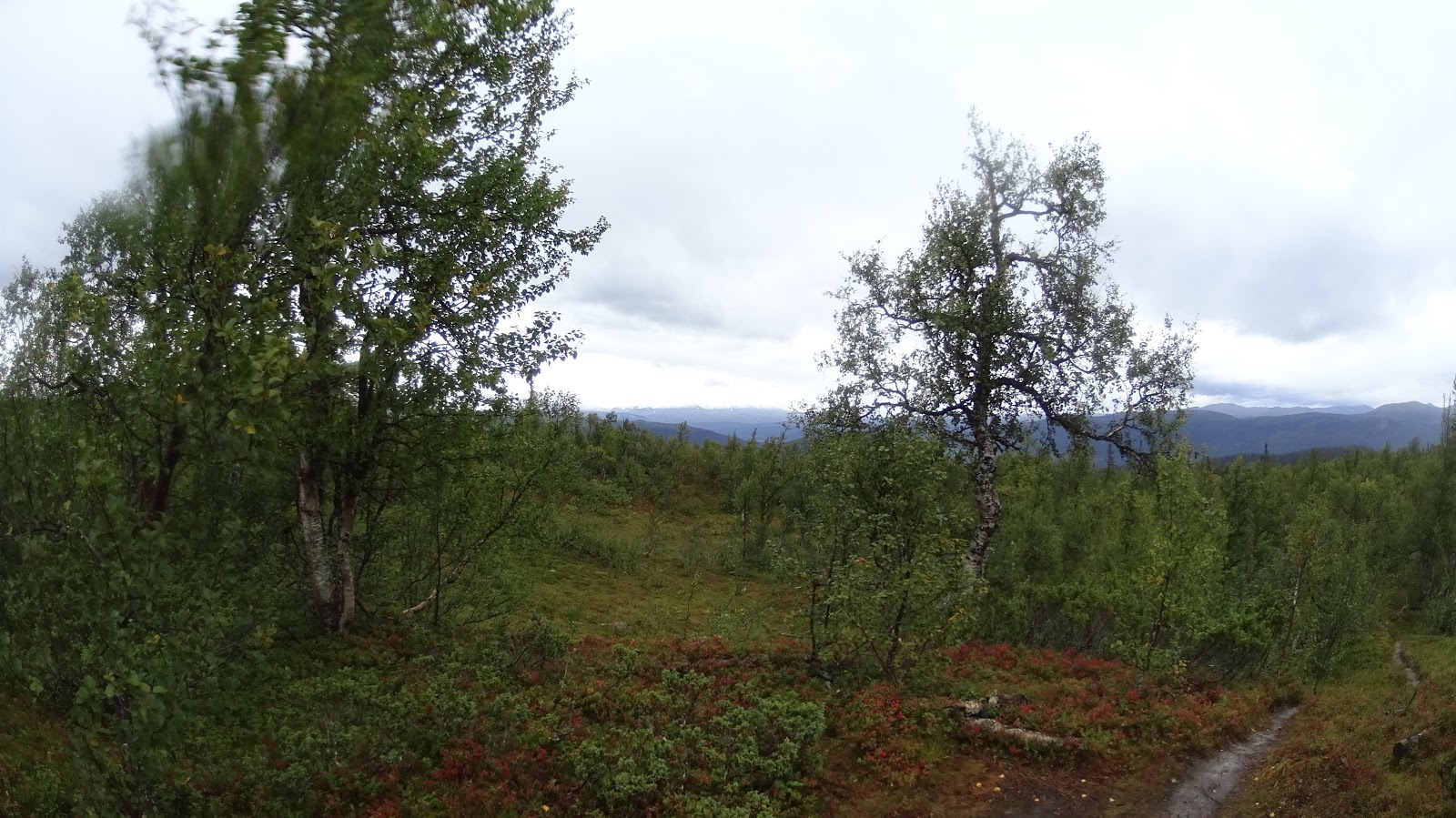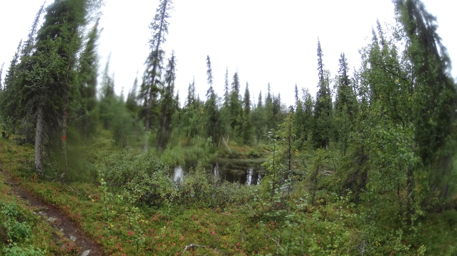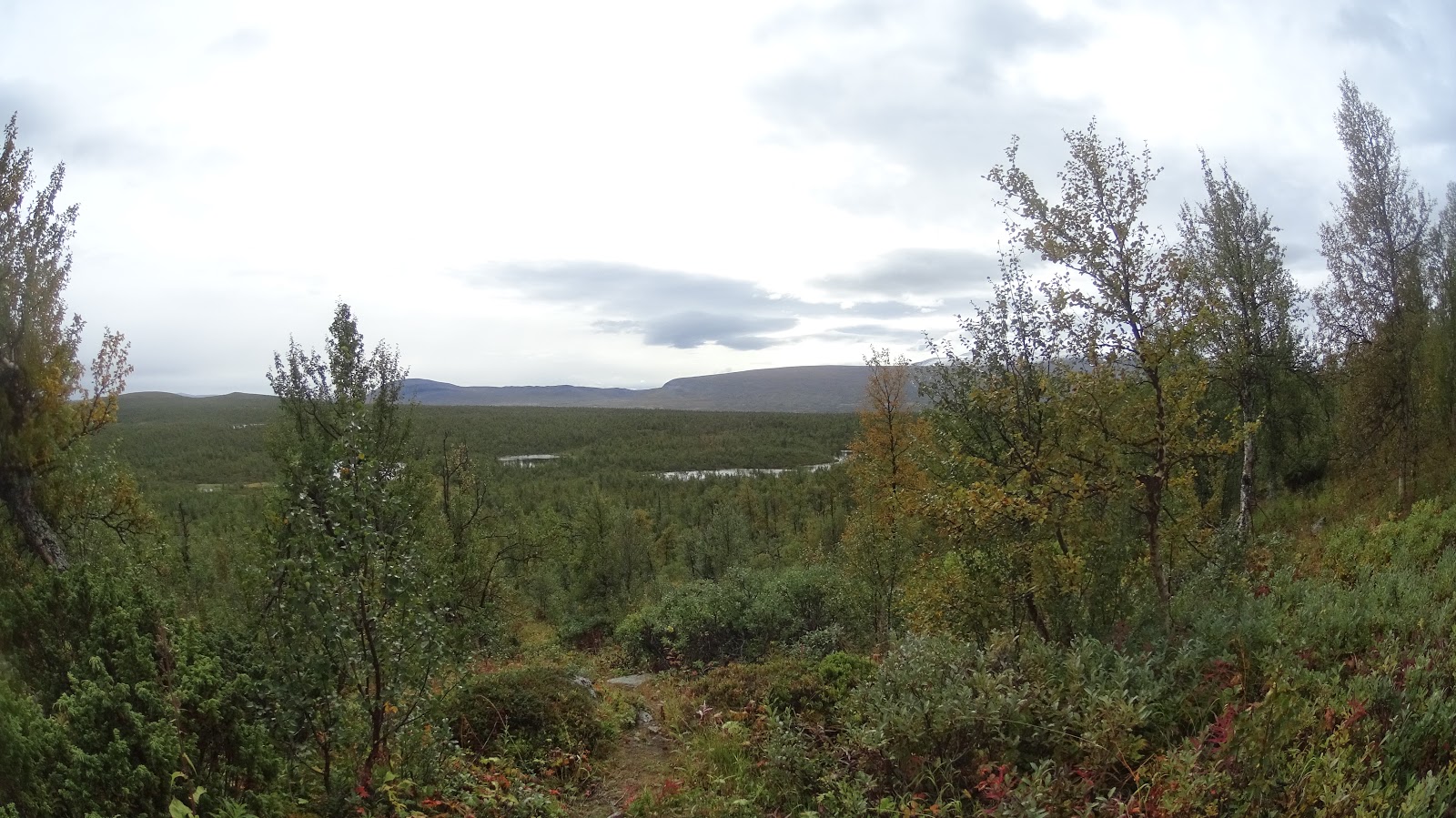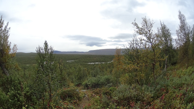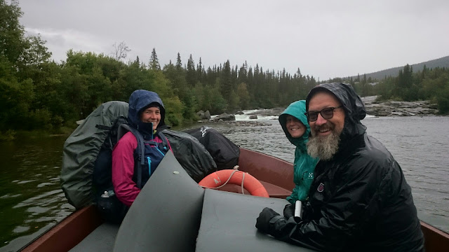 Regnet föll ymnigt när jag gick ner till båten. Jag var givetvis för tidig så det var bara att vänta. Efter ett tag kom två tjejer ner, det var de som beställt båten skulle det visa sig. De var båda Gröna Bandare. Anna från Dalarna (Sveg) och Hanna från Luleå, numera bosatt i Gbg. Med dem var Dara, Annas hund. Lite försenad kom Björn med båten. Han hade blivit försenad då han kört in med propellern i ett renstängsel. Han gav oss en liten trevlig sightseeing i deltat innan han släppte av oss på sydsidan. Det regnade fortsatt och jag kom iväg före tjejerna. De första 6-7 km var skog och kraftigt motlut. Jag blev snabbt varm under regnkläderna och så fort det höll upp åkte huvan och handskarna av. Det fortsatte att stiga och jag började leta efter någon fikaplats. Här och var såg jag bajshögar av något som definitivt inte var ren eller älg. Fullt av blåbär. Då och då kom en pust av muskig doft i vinden. Vid varje myr stannade jag till och tittade, men ingen nalle så långt ögat nådde.