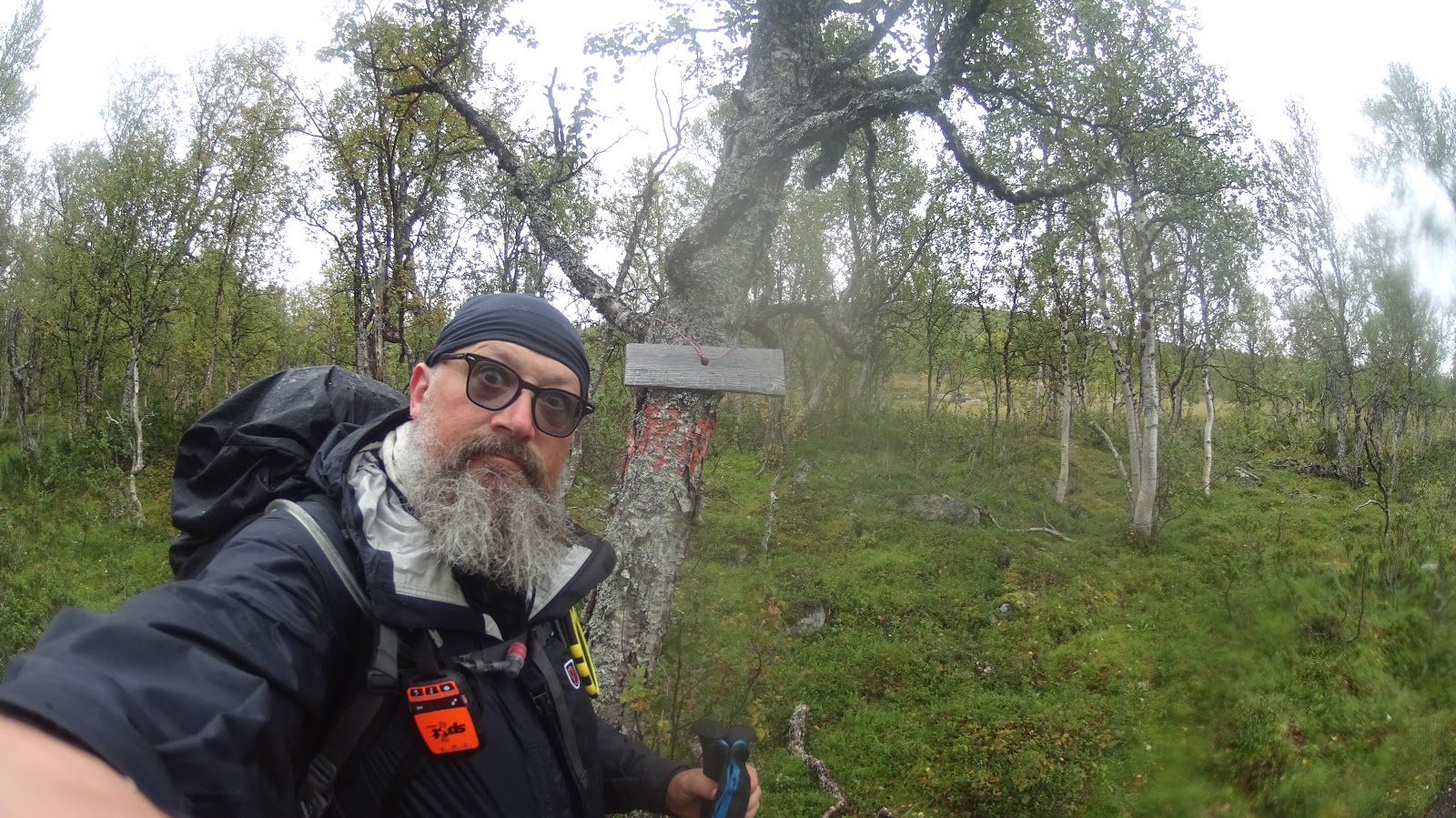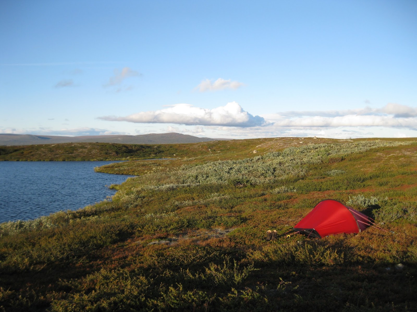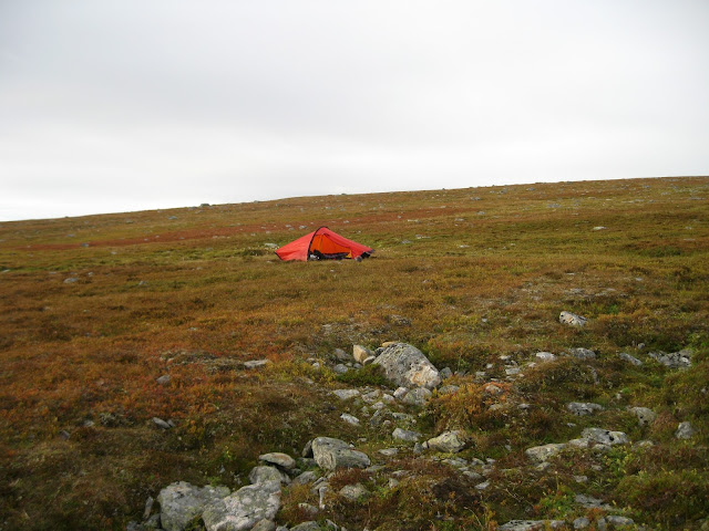 Till på köpet, på andra sidan drällde det inte direkt av tältplatser. Det fanns en bra och den var herrarna snabbare än mig till. Man kunde slagit upp framför ett par fritidshus också ("Det är ju ingen där") men det kändes inte bra. Jag sa till dem att jag skulle gå lite längre på leden och se om jag hittade något. Nu var det ju så att det var fortsatt sumpigt och på råga på det brant uppför, på fjället. Leden följde en bäck så jag tänkte att någon liten platå kanske fanns. Trodde jag... Efter ett tag hade jag gått för långt för att vända om, det var bara att knata på. Uppe på kalfjället blåsste det rejäla västliga vindar. Jag kollade kartan och siktade in mig på två tjärnar leden passerade mellan. Den ena låg kanonbra men helt öppet = fullt blås. Jag gick runt lite i terrängen och fann en sned plats vid den andra där jag fick lite lä av en kulle. Det blåser fortsatt och rycker och drar i tältet men det får duga. Klockan är 19:30 och jag känner för att sova länge. Kommer vädret tillåta det? Det positiva i detta elände är att jag nu har ca 15-16 km kvar till Jäkkvik och jag har redan avverkat stigningen på etappen. Heja mig! Fast seriöst, två nätter och vilodag i Jäkkvik känns mycket rimligt.