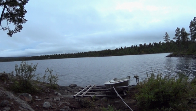 När jag kom fram till roddleden var det som jag befarat. Bara en båt på min sida, dvs jag skulle få ro tre gånger. Jag övervägde att vänta på G&A och på så sätt dela på roddarna på tre. Å andra sidan hade jag ju ingen aning om hur långt efter de var och jag ville inte bli för sen. Jag förberedde båten, öste den och la i ryggsäcken. Drog ut på det så mycket jag kunde. Jag var helt enkelt lite skraj. Jag är ingen van roddare och vinden låg på en del från öst. Jag tänkte att jag i värsta fall väl fick stranda väster om båtläget och dra fanstyget efter strandkanten. Jag hade precis samlat mod och beslutat mig för att börja, i bästa fall fick G&A komma lagom tills det var dags för den tredje rundan och hjälpa till då. Det fanns inte heller några flytvästar. Då ser jag till min stora glädje att en vandrare dykt upp på andra stranden! Jag kollade i kikaren och han var väldigt resolut, la ryggsäcken i båten och gjorde sig redo för avfärd. Jag hoppade i och rodde iväg.