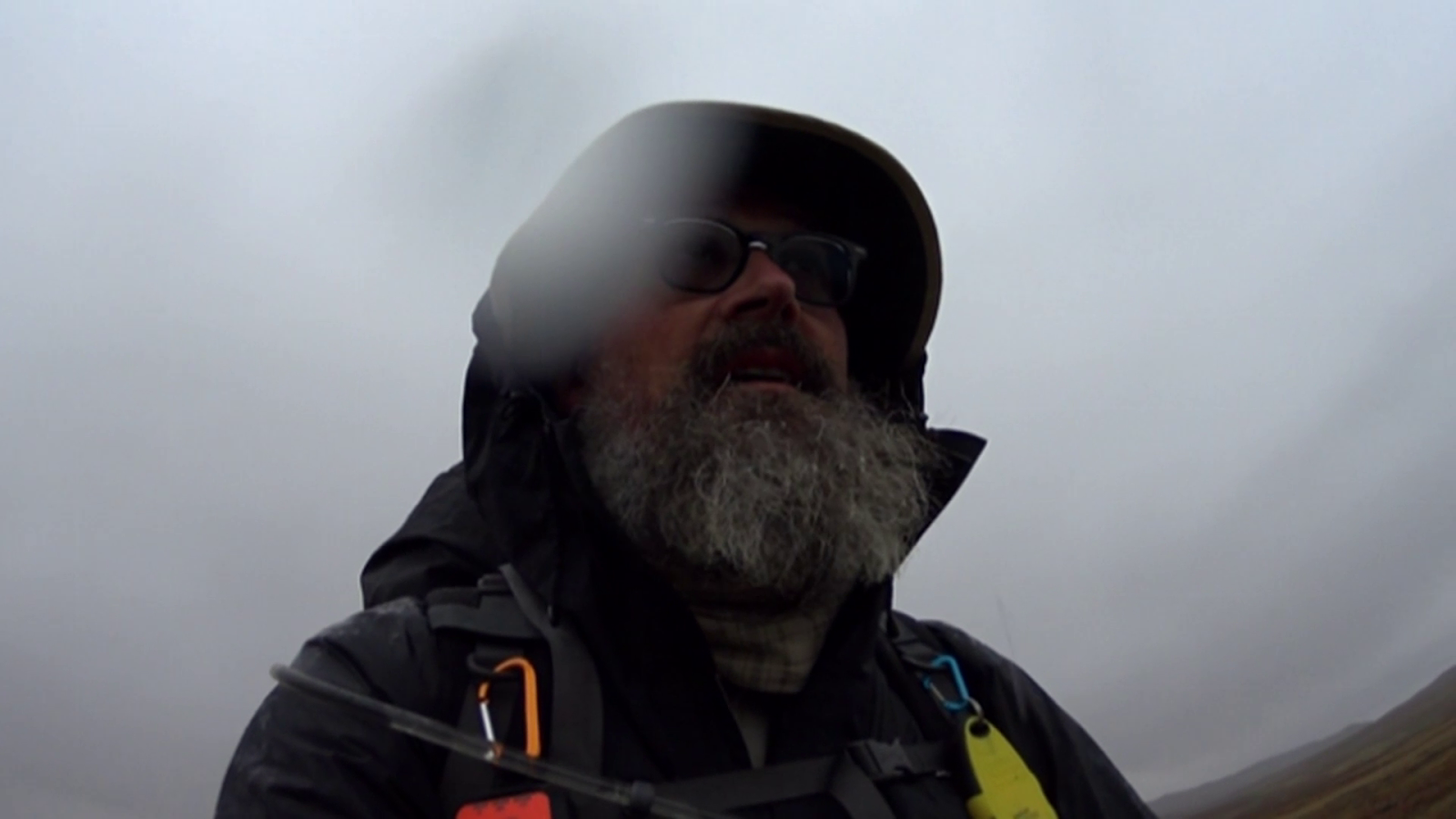 Efter några km på fjället vek leden av och ner i björkskogen. Regnet tog i och i kombination med ett brant medlut var det att se upp hur man satte fötterna. hala stenar, lera som blev lerigare, rötter som var svåra att se och översvämmade bäckar gjorde det hela till en utmaning. Man ångade även inifrån så efter ett tag immade glasögonen igen också. Även om det då och då höll upp så behöll man huvan på eftersom det fanns gott om regntunga grenar med lövverk som mer än gärna lättade på sig när man gick emot dem... Och vad händer då? Jo, givetvis blir jag omsprungen av ett gäng löpare som studsar utför den brant jag så försiktigt trippat nerför. Att de vågar! Väl nere vid ett stigskilje stod de samlade och väntade på någon kompis så jag passade på att fråga om det inte var farligt? "Näh, vi har som dobbar" sa en tjej, visade undersidan på sina skor och ryckte på axlarna. Någonstans är det ändå imponerande.