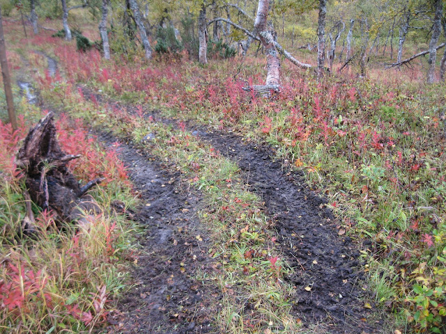 Enligt kartan skulle sommarled och vinterled följas åt hela denna sträcka, plus att det även var led för terrängfordon. Riktigt så såg inte verkligheten ut. De gick lite om varandra så man fick hålla koll vilket i sig inte är det lättaste när man pga väder mest stirrar i backen. Lägg därtill att sommarleden inte var märkt alls och att man därför ibland hade följt terrängfordonsspåren och plötsligt befann sig en bra bit från vinterleden, eller som vid ett tillfälle i björkskogen, inte såg den alls och trodde jag gått fel. Jag vet, det är ingen tillrättalagd Disney-park detta, men att märka leden tydligt känns som det första man ska göra. Det där med att kombinera led och terrängfordon är inte heller lyckat. Det blir helt sönderkört och lerigt. Inte bra.