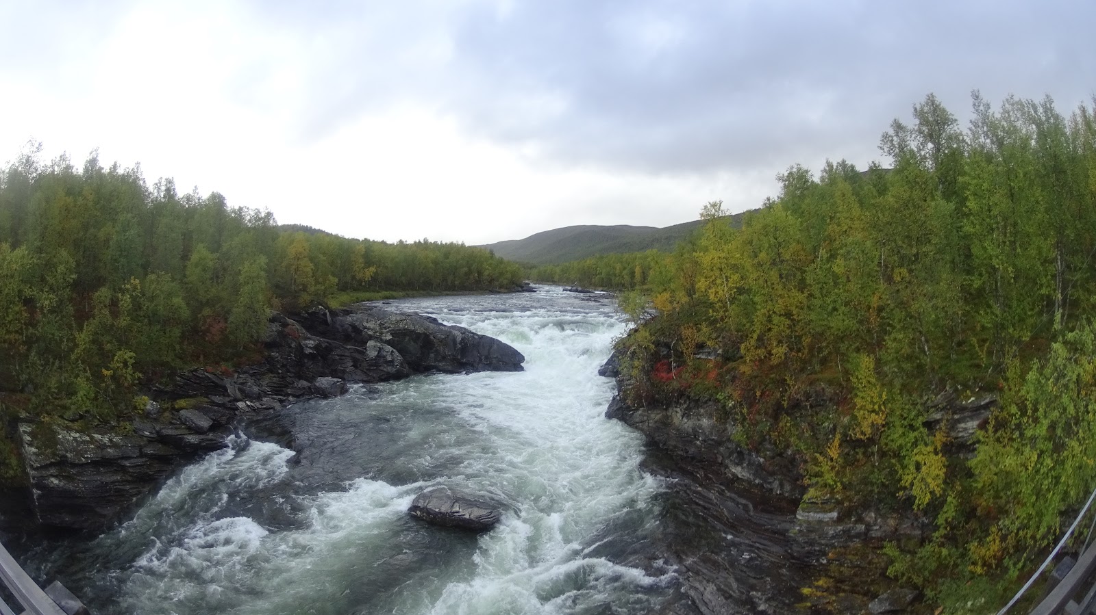 När vi gick upp kunde jag konstatera att alla linor och pinnar satt på sin plats. Vårt fina Hilleberg Nammatj EX hade gjort sitt jobb med den äran. Efter en stund kröp solen upp över fruntimmersklumpen och på Lottis sida blev det snabbt varmt i tältet. Lika bra att gå ut och medan Lotti tömde liggunderlag och packade sovsäckar började jag koka havregrynsgröt med blåbärssoppepulver. Vi var inte först ur tälten men långt ifrån sist. Folk kravlade ur sina kokonger och man hörde gasolkök brusa lite här och var. Himlen var blå och nästan molnfri och från söder blåste en kraftig vind. När klockan var vart i nio var vi redo att ge oss av och påbörjade den tre km långa nedstigningen till bron igen för att där vika av norrut över fjället. På vägen ner gick vi över ett antal små bäckar och i nästan var och en av dem stod en öring. Det fick mig att minnas när en ganska stor sådan hoppade över min fot vid ett vad på Kungsleden. Det är så häftigt att de lever i dessa miljöer.