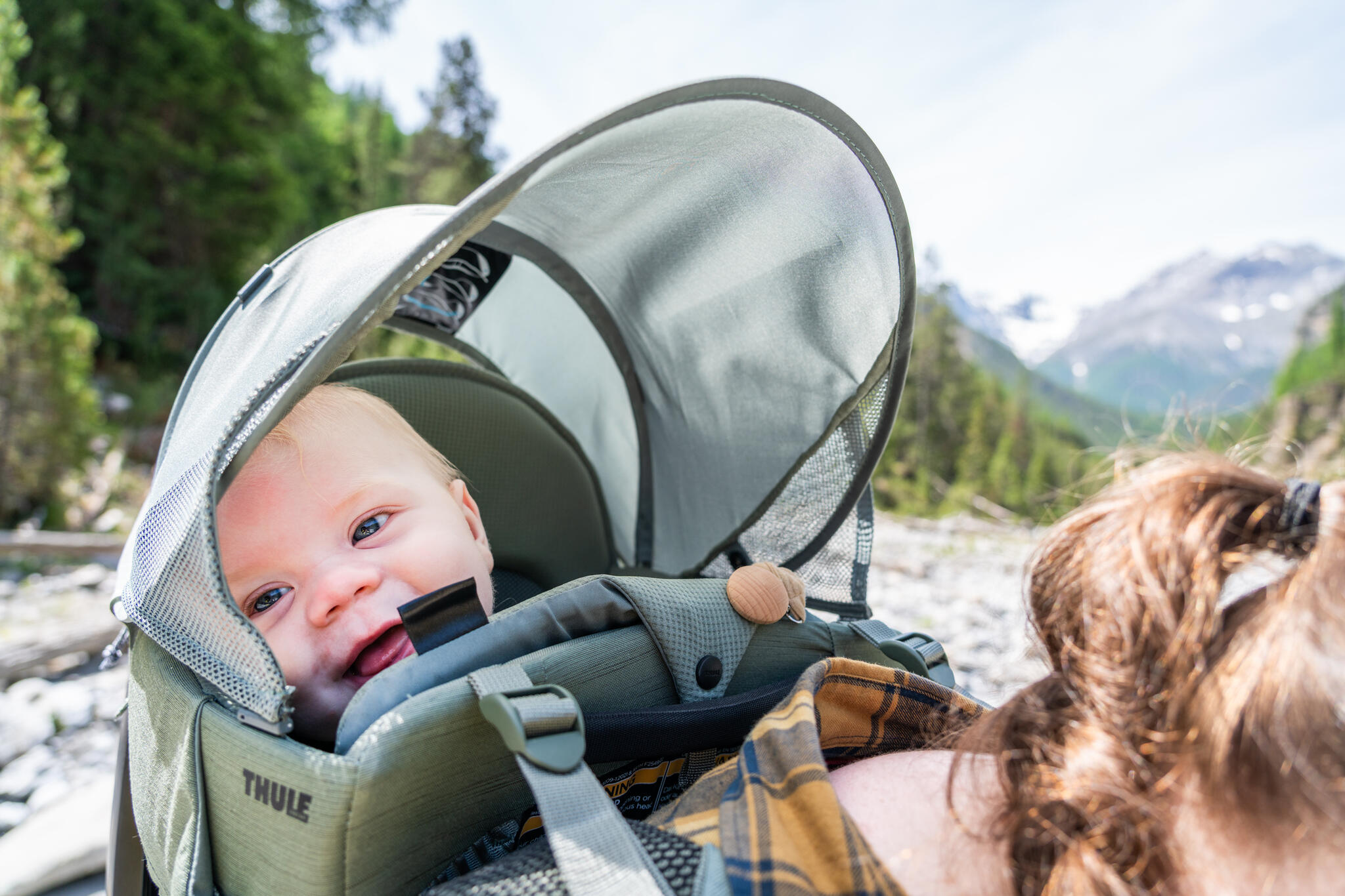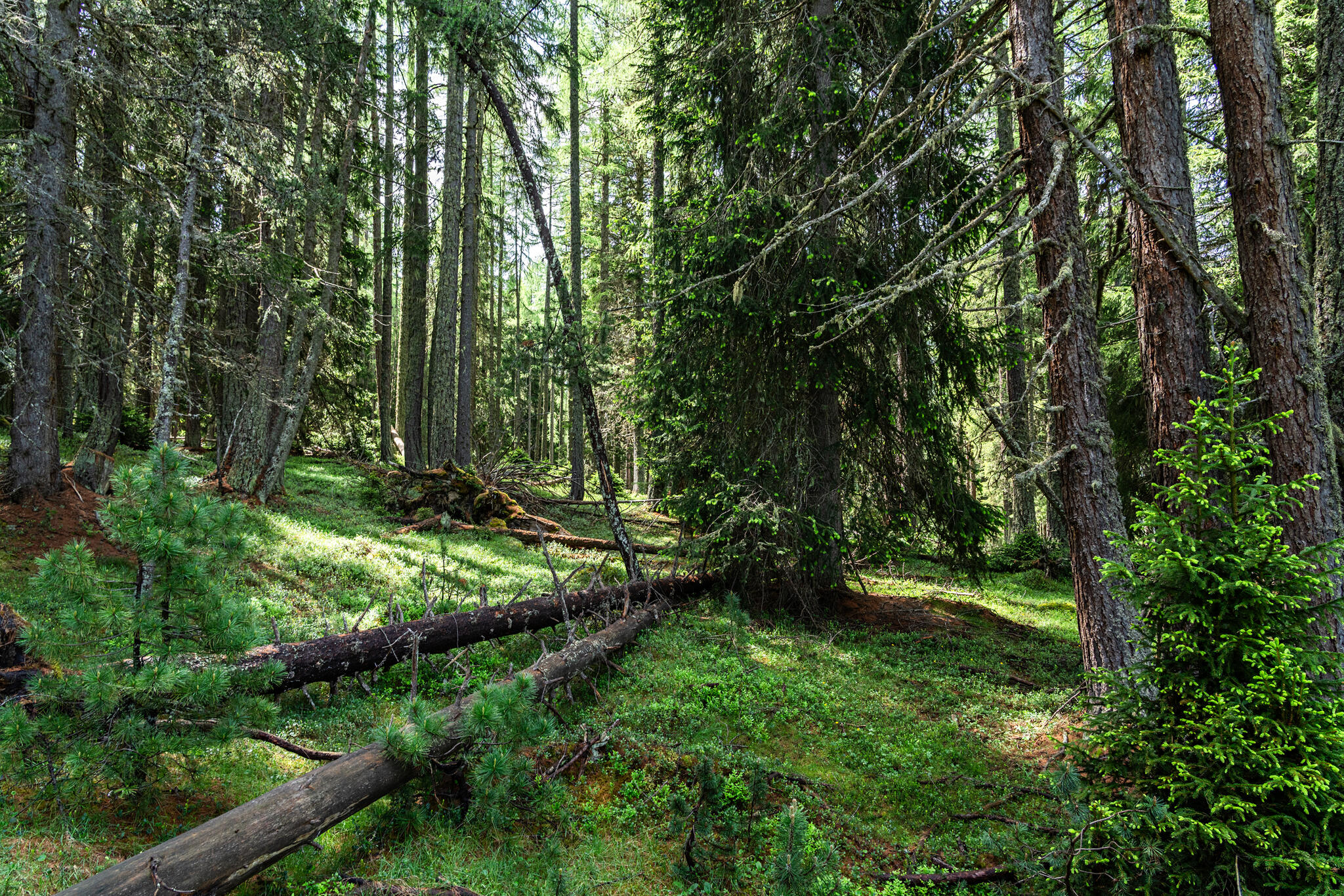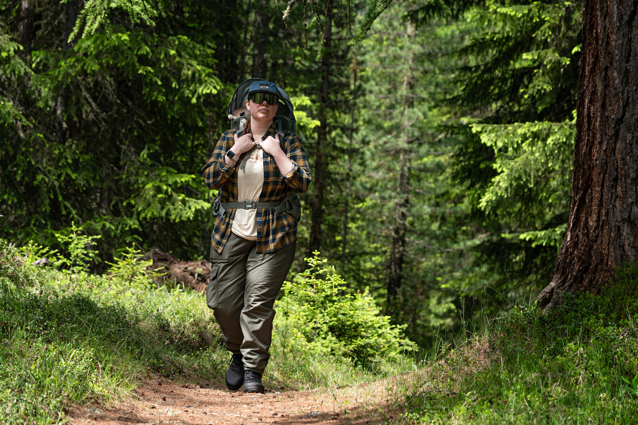 Vi fortsätter dock uppåt och kliver in i den djupa granskogen. Helt plötsligt känns det som vi står i vilken svensk granskog som helst. Det är bara de höga bergstopparna som ibland skymtas mellan trädkronorna som avslöjar var vi är. Det är ett lugn som kommer över oss som jag tycker man bara kan få när man är i naturen så här. Fåglarna kvittrar och solens strålar bryter igenom bland det gröna myllret. Det enda vi hör som inte är från skogen notblad är Antons lätta snarkningar från bärstolen. Han har med bravur lyckats sova sig igenom det mesta av vår vandring, bara för att vakna till när det ska ätas eller bytas en blöja. Vissa har det bra.