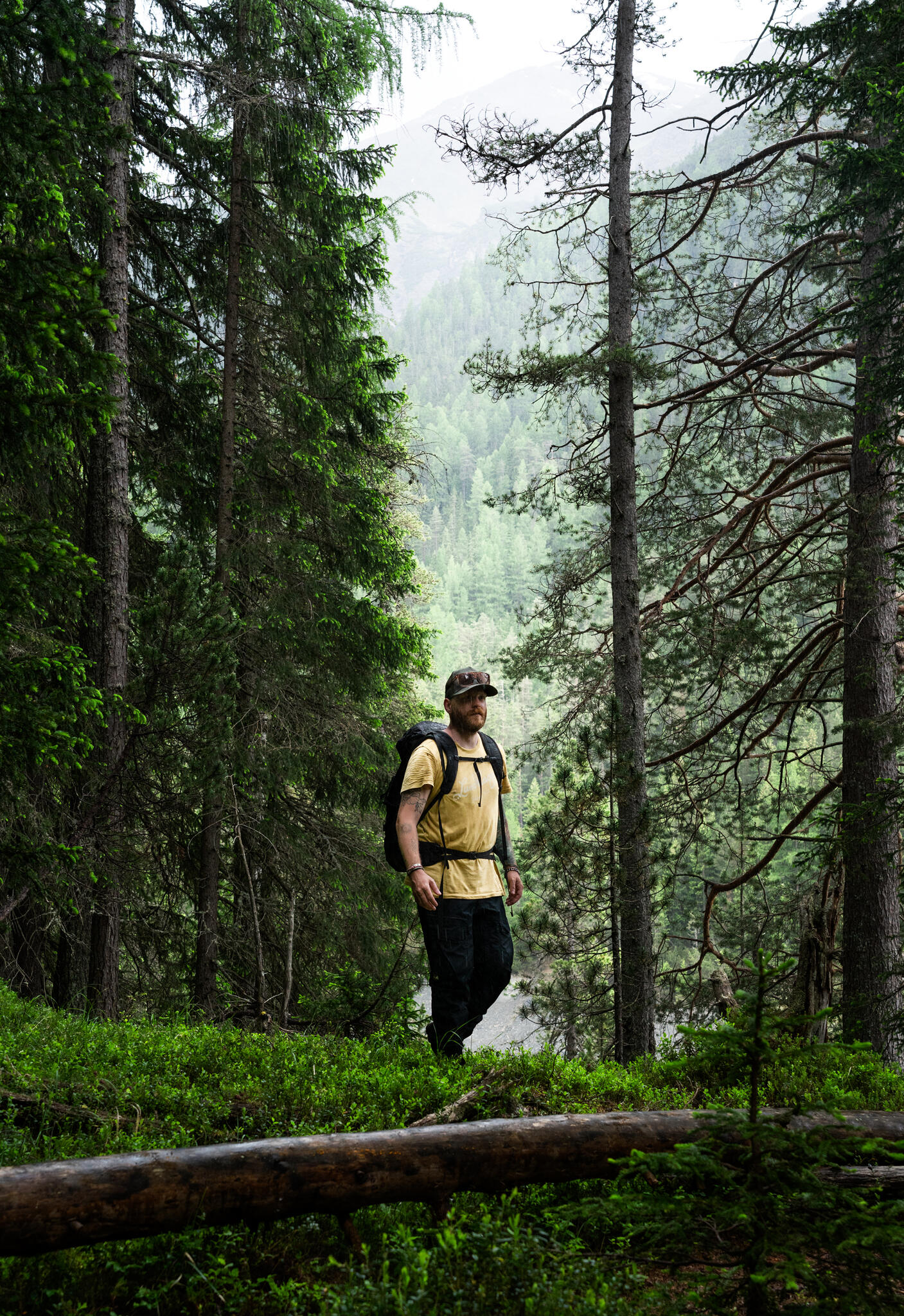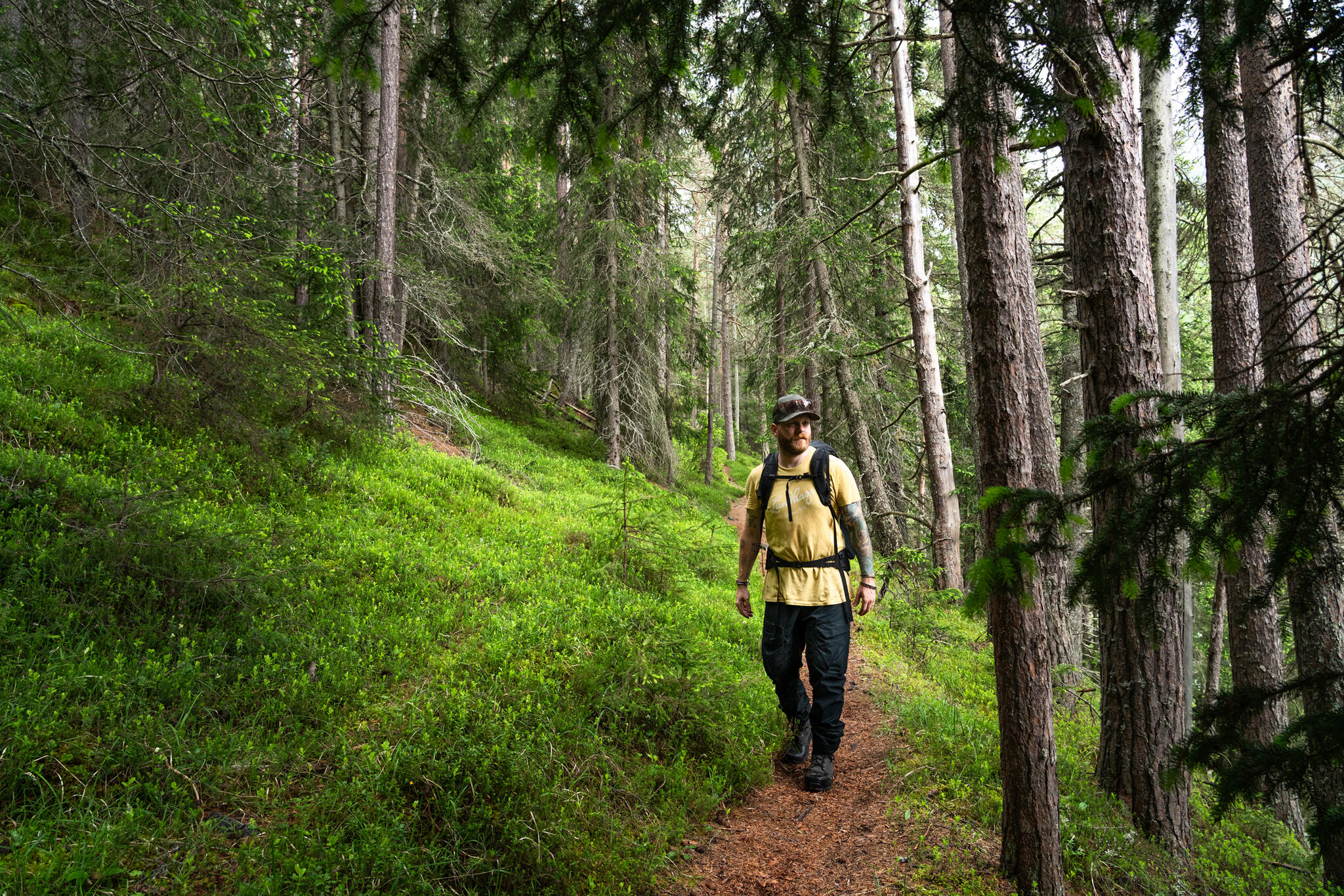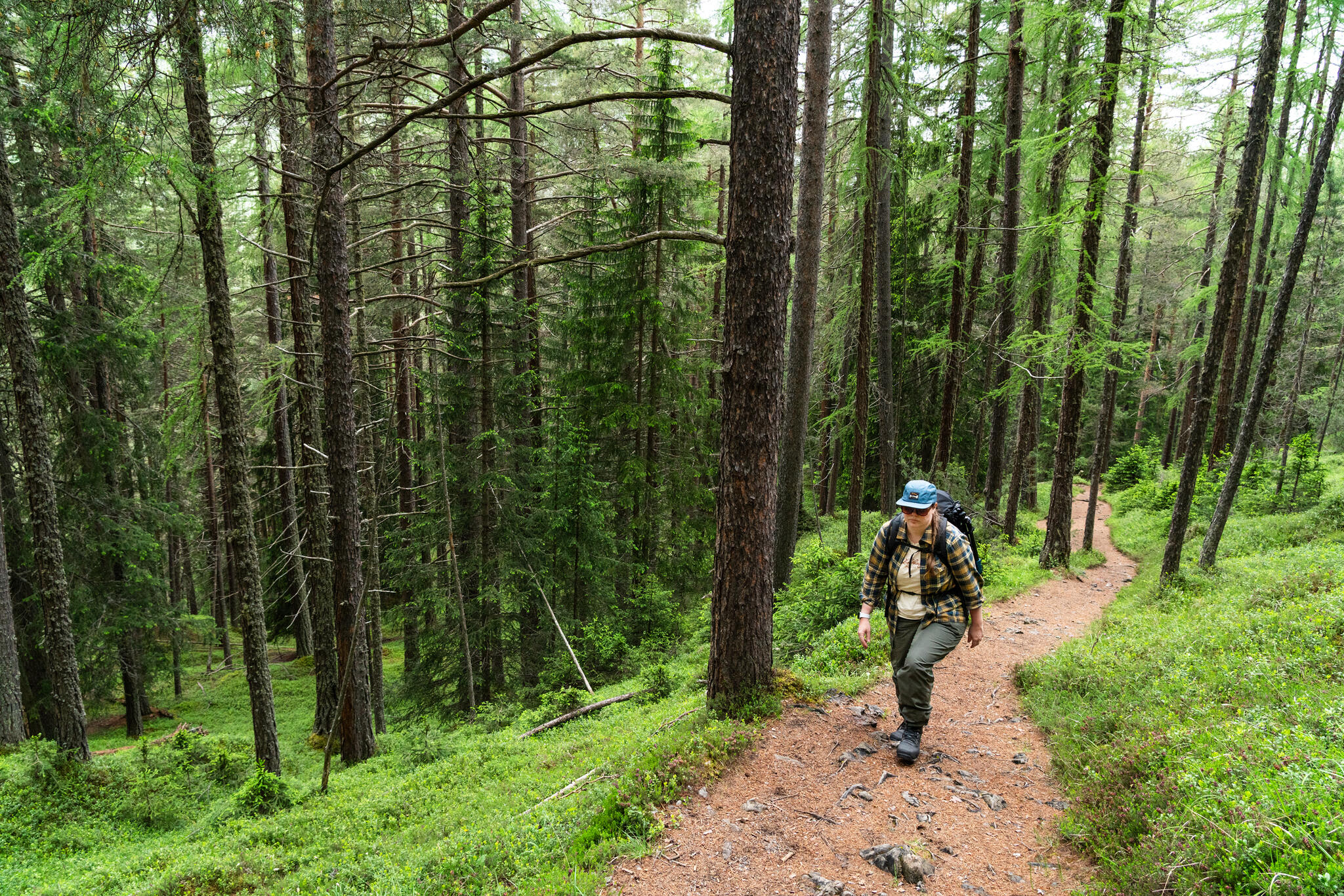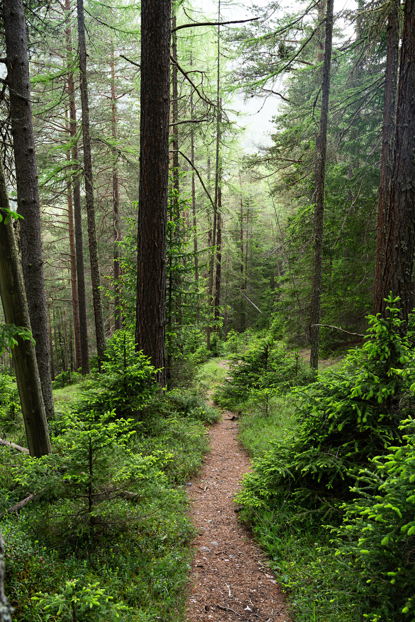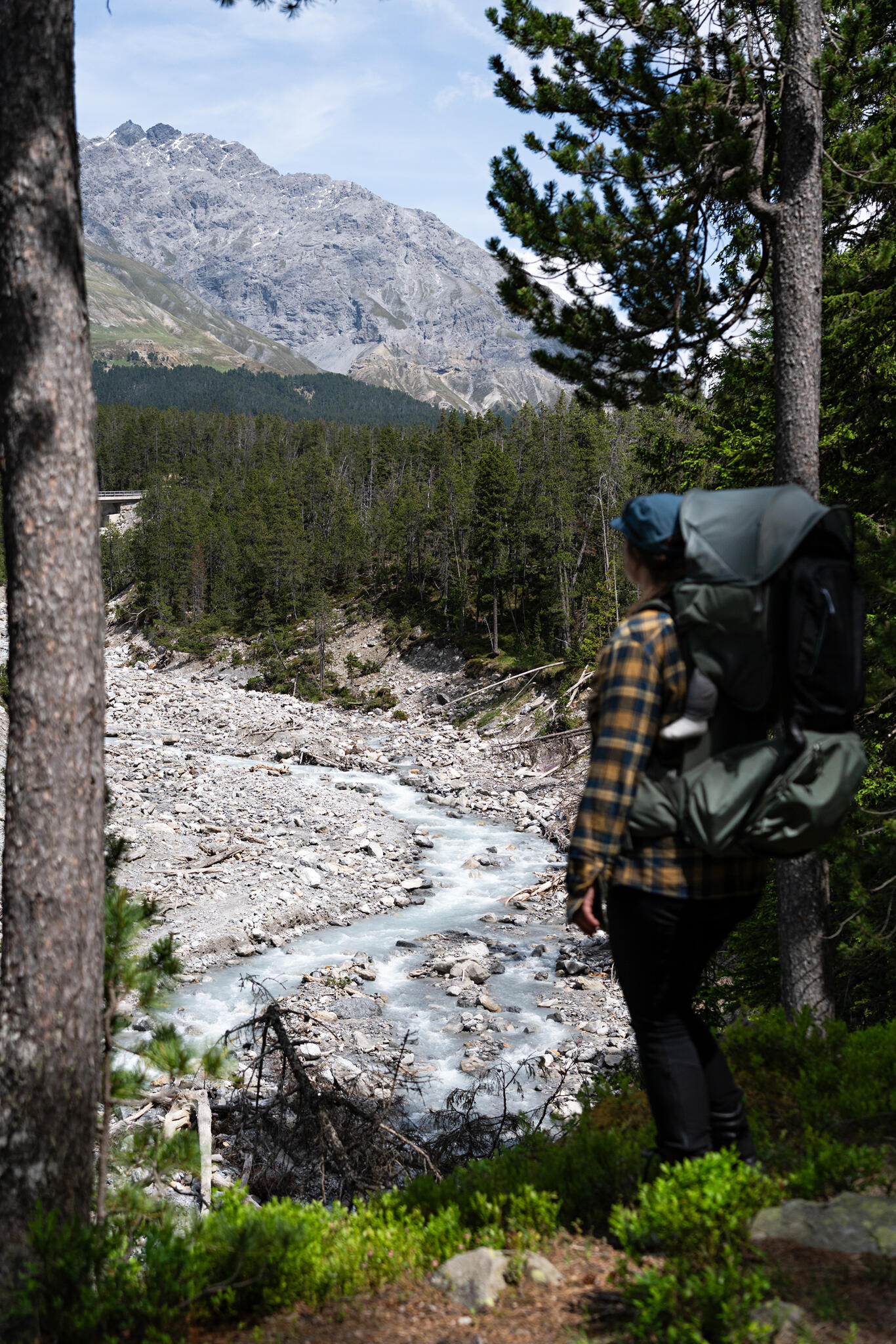 Men det gör inte så mycket. Utsikten och pirret i magen när vi kliver över den hängbro är gott nog. Medan Malin och Anton fortsätter tillbaka upp mot bilen, beger jag mig ut på 09 Margun Grimmels för att se om jag kan komma närmare vattnet. Det är något med att röra vatten när man ser det. Ju längre in i urtidsskogen jag går, ju mer påminns jag om Sverige. När jag är nere så nära ån som jag kan komma blir stigen flackt, och jag kan lugnt promenera i min egen värld. Efter en stunds utforskande börjar mörka moln rulla in, och jag bestämmer mig för att vända tillbaka och ta mig uppför till “Buzzen” och familjen. Jag hinner inte långt innan det smattrar i skogen. Det är något behagligt och naturligt rent med regn i djupa skogar. Oförstört och urtida.