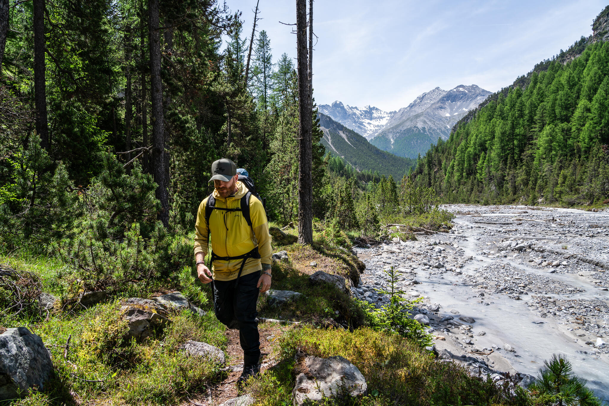 Andra dagen i nationalparken erbjuder klart bättre väder än gårdagen. Solen skiner och vi kommer återigen upp i nästan 30 °C. Det är extremt varmt. Men dagen kommer att bjuda på en enklare vandring på 14 Punt la Drossa – Il Fuorn längs med Ova dal Fuorn. Vi parkerar strategiskt vid P4 igen och beger oss snabbt över den snirklande bilvägen. Även om det är tidig morgon så är också sportbilarna och motorcyklarna uppe. Denna korta rutt på bara 2,5 kilometer är, likt vår parkering, strategiskt vald. Den har en ytters modest stigning på 83 meter, och tar oss tillbaka till Il Fuorn för ännu en lunch i solskenet. Även om Punta la Drossa på pappret är en liten tur, så erbjuder den vyer och naturupplevelser som vilken tremila vandring som helst. Här får vi vandra längs med vattenkanten, få röra vattnet och följa Ova Dal Fuorn längre upp i dalen. Även om vi är på någorlunda hög höjd så känns det som vi befinner oss på havsnivå här nere.