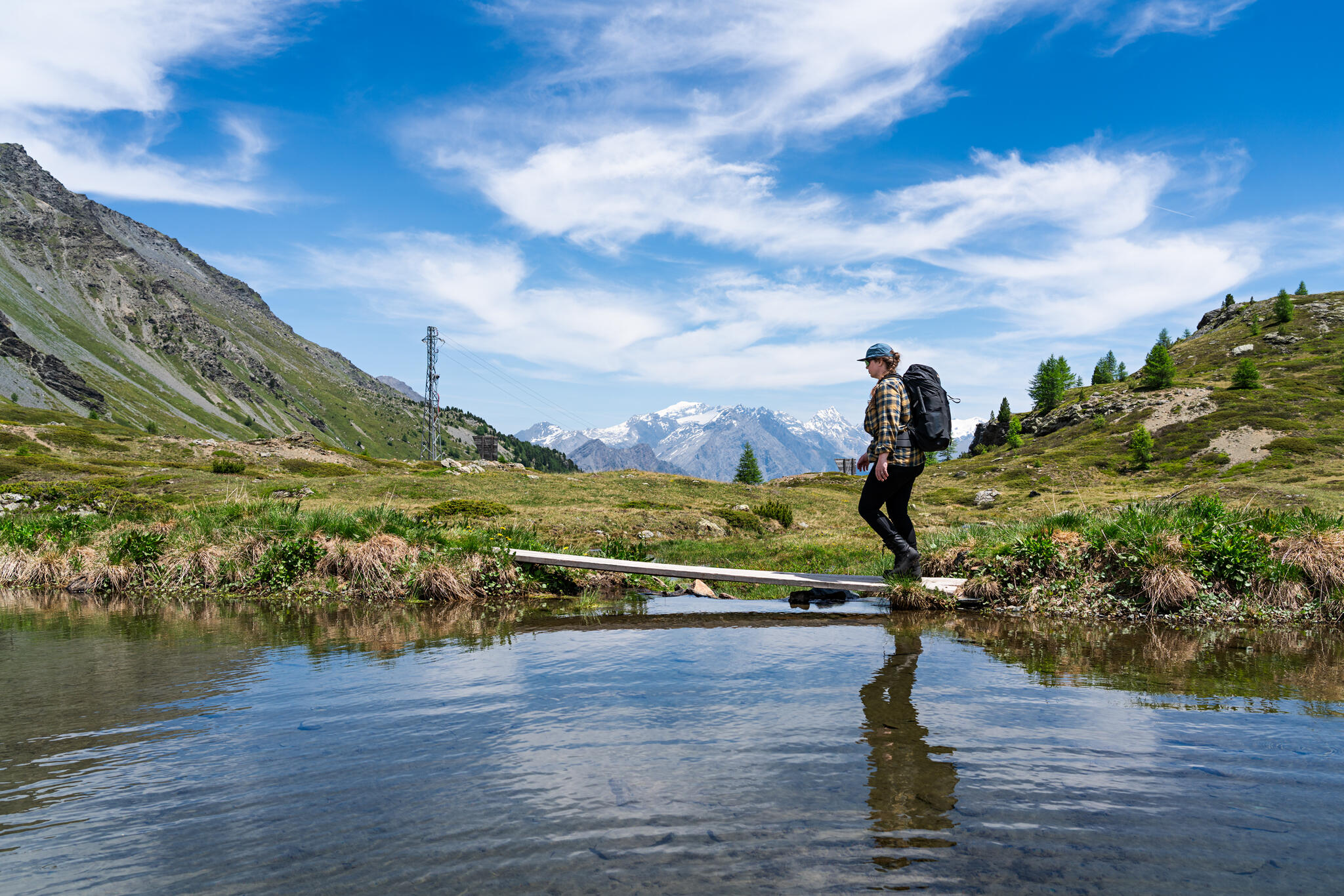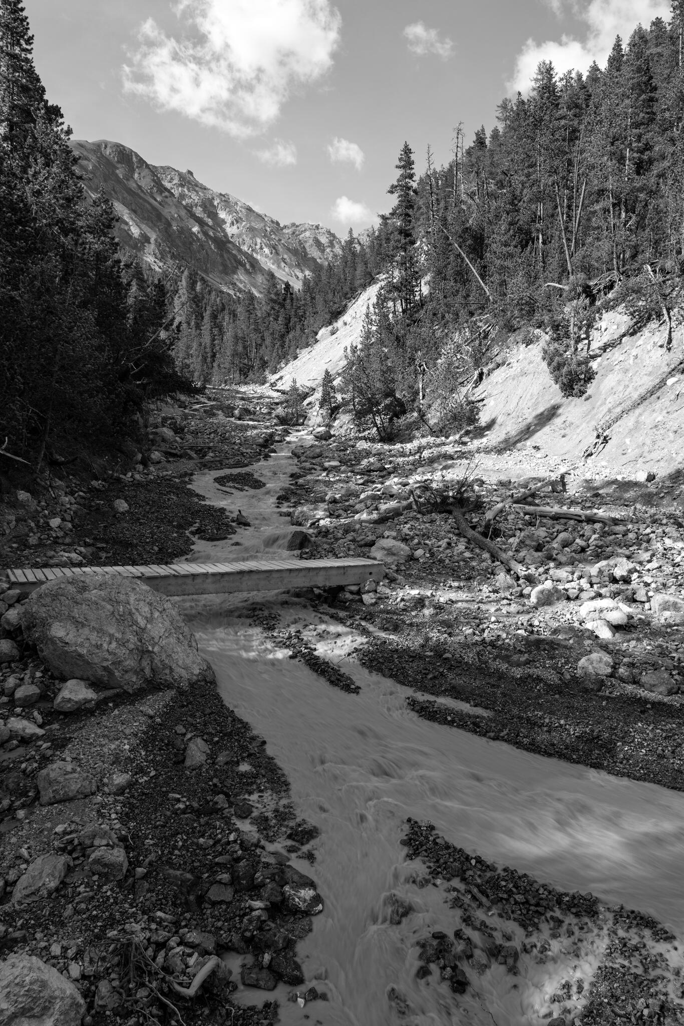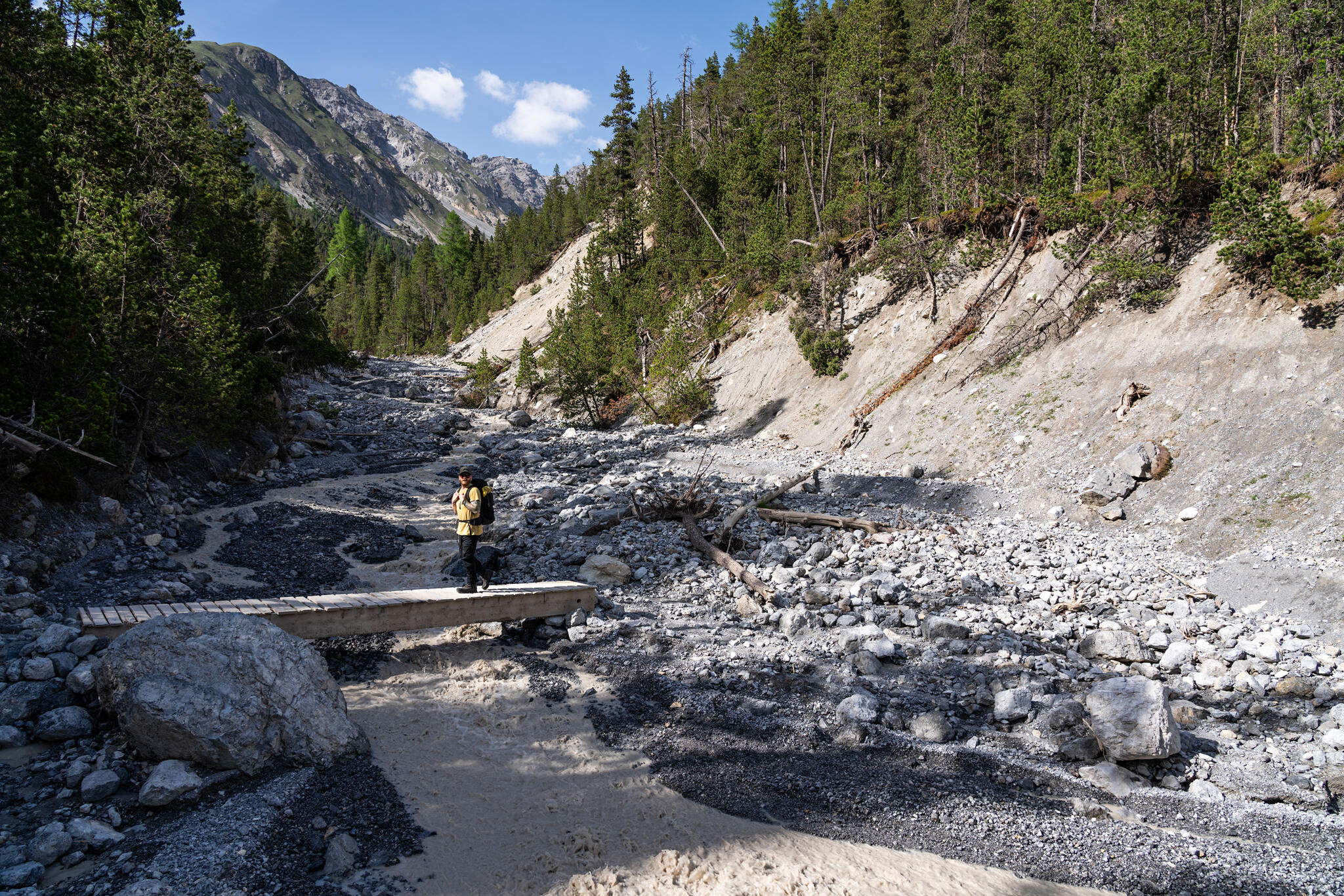 Det vill säga vi som gillar ett lugnare tempo. En grönskande kilometer senare bryts leden av av en korsande å som kommer uppifrån Munt Chavagl, 2543 meter över havet. Det syns att det är torrare väder nu och värmen har gjort sitt. Stenarna hintar om en bredare å när smältvattnet är som störst. Nu är den mer en sömnig porlande bäck.