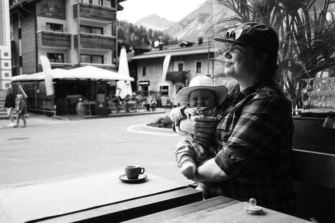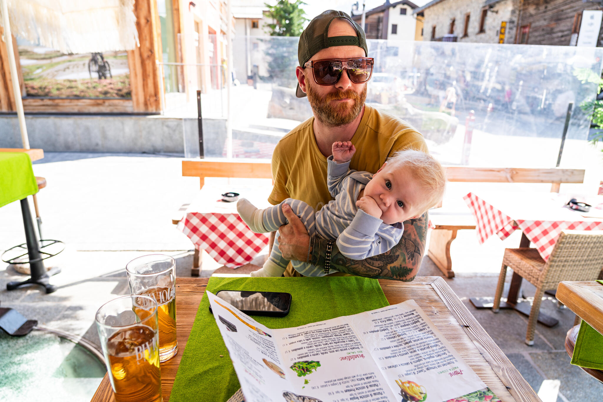 Här turas vi om att gissa förbipasserandes livshistorier, unnar oss ett till glas italienskt vin och tittar på lokalbor som systematiskt matar fåglarna på uteserveringen trots skylten ovanför deras huvuden. Solen lägger sig sakta bakom bergen vid vår lilla lägenhet. Anton sover i den enda säng som finns, medan vi sitter på uteplatsen, äter en pizza och dricker italiensk öl. Vi ser solens sista strålar nå bergstopparna och bestämmer att detta är något vi ska göra igen. Som förstagångsföräldrar är allt nytt och läskigt, från en ny nyans av brunt i blöjan till dagar på Autobahn. Morgonen efter har solen inte hunnit sig över de italienska bergen när vi kör in i Munt La Scheratunnel för sista gången.