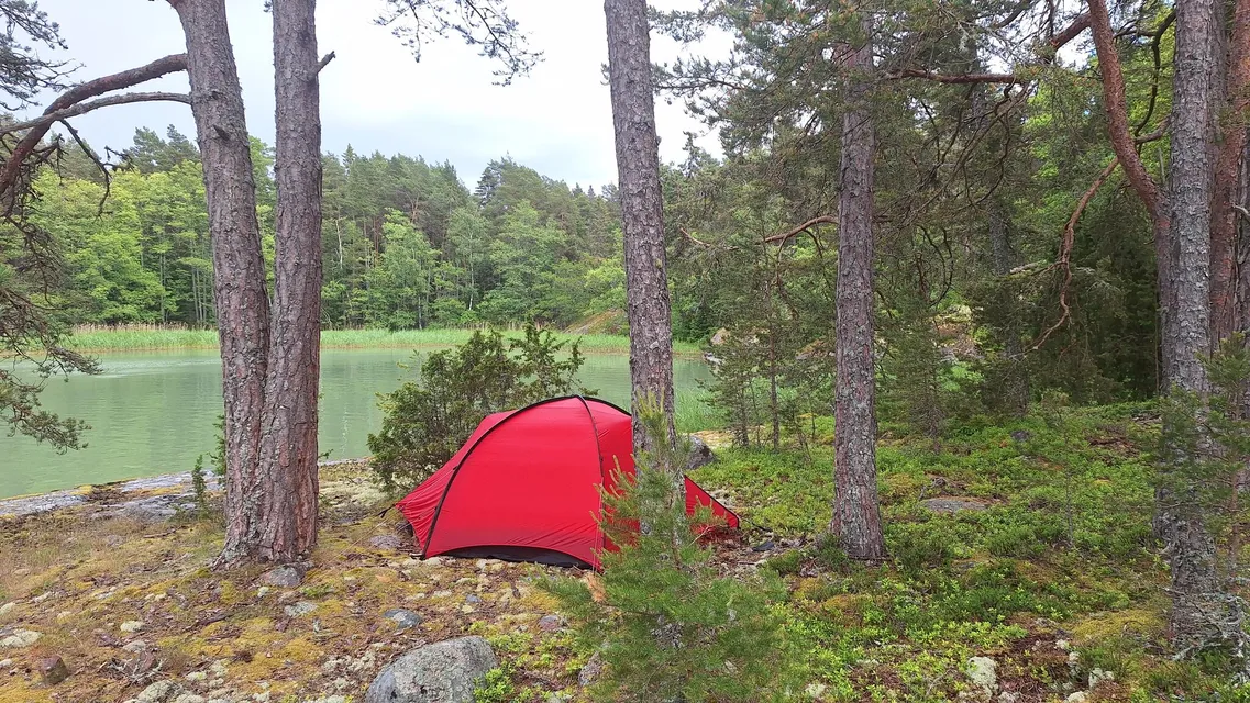 Jag stannade spontant på Långgarn för att jag råkade passera en bra lägerplats (och nästa överfart var i motvind). Men jag fick strax sällskap av ett mycket trevligt ungt par som tagit båten ut för en kvällsgrillning. God mat och gott sällskap och en vattenpåfullning bjöd de på. Tackar så mycket!