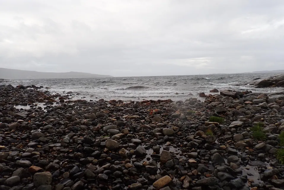 Från en lung kväll blev natten blåsig och regning som höll i sig en bit på morgonen. Jag hade hoppats på lite sol medans jag packade ihop för att få saker lite mindre blöta. Men det regnade på. En rätt knepig startstrand var det också, tur vad fanns en skyddad högvattensvik som jag använde.