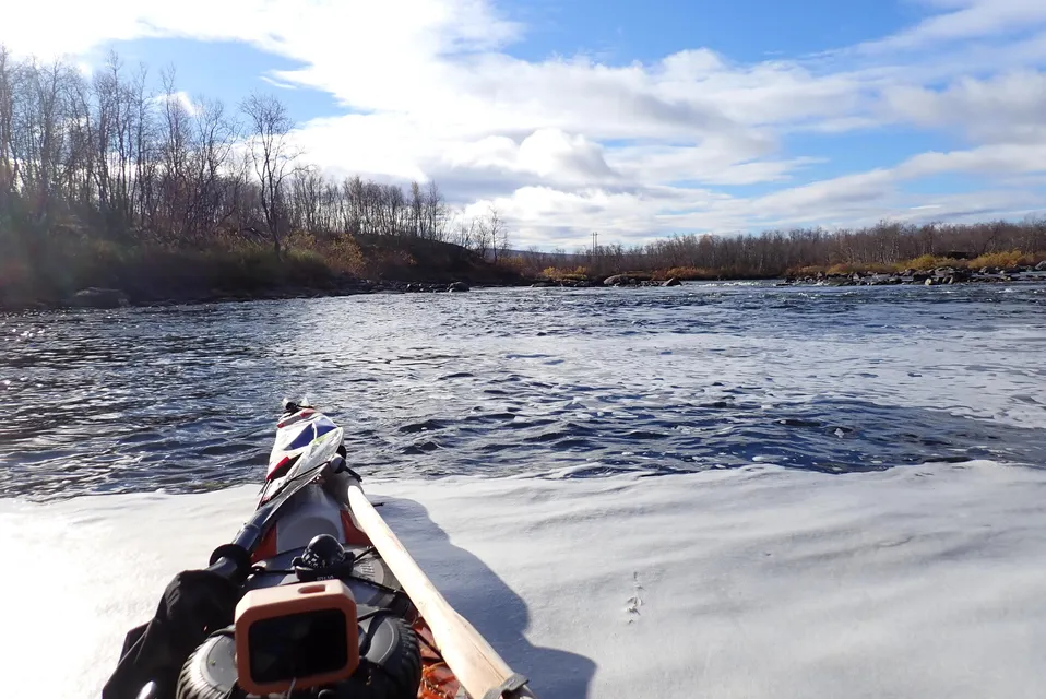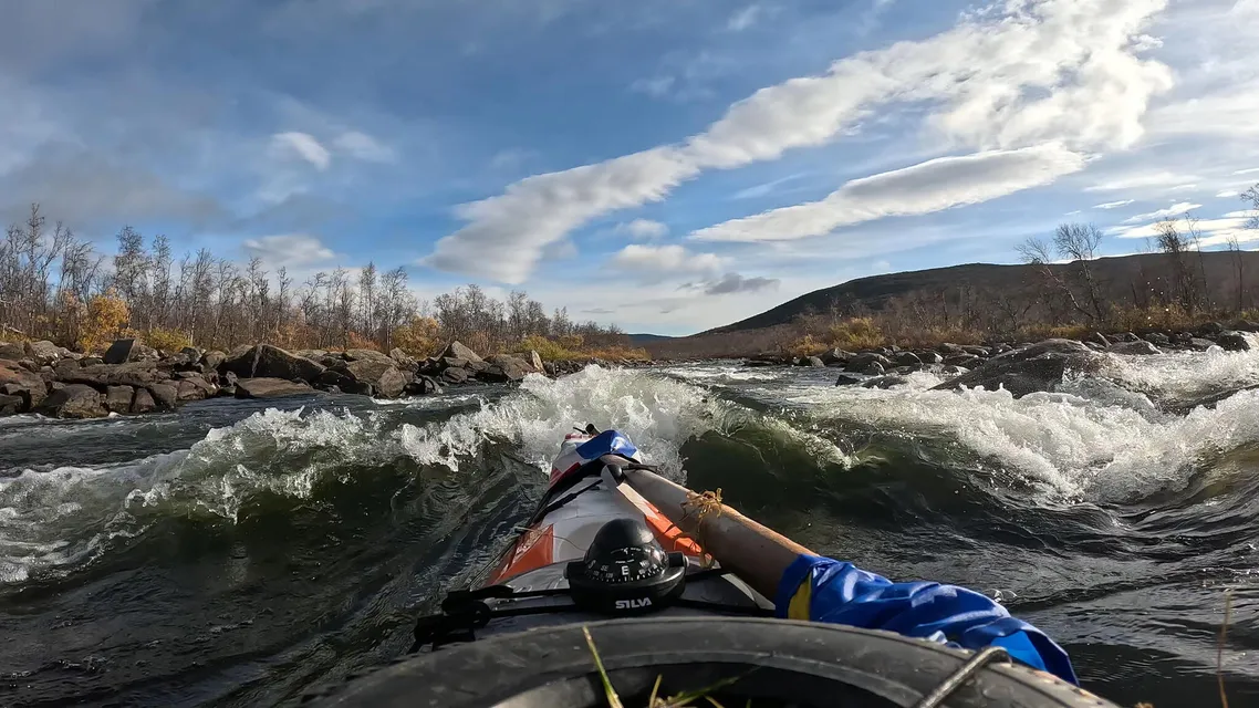 Det var frost under natten så ihop packning var en något kall affär. Det blåste också en hel del, men medvind. Det var dock knepigt på sandbankerna när den kom från sidan och jag drev på grund. Det gjorde också forsarna lite knepigare för jag behövde hantera vinddrift och att kajaken vände upp mot vinden.