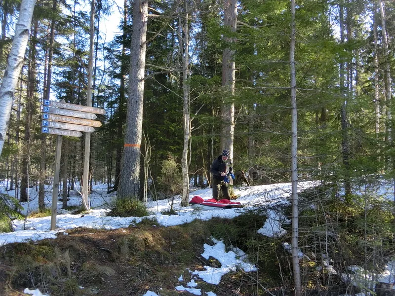 Det har sina sidor att ge sig iväg på skidtur i mitten av april. Våren hade anlänt till Hallsberg där min resa började. Både jag och pulkan kände oss aningen obekväma i väntan på att få gömma oss i vår kupé.