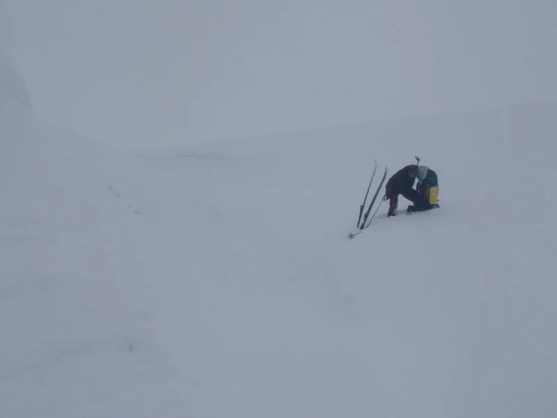 Vinden hade mojnat något. Den pendlade mellan 10 och 12 m/s, sydlig till sydostlig. Alltså sidvind till en början. Så småning skulle vi nog komma i lä av Lill-Stensdalsfjället. Men sikten! Man såg i princip ingenting. Det var både dimma och blötsnö. Man såg nätt och jämnt till nästa kryss.