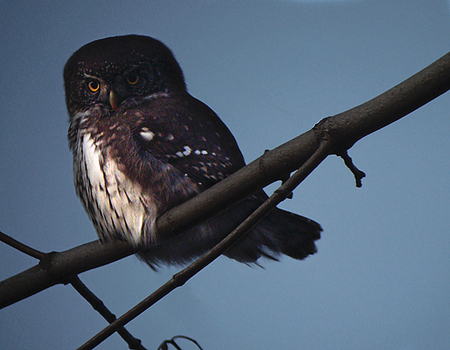 Visst är det en sparvuggla! I omgivningarna fanns tre sparvugglor. Denna ville gärna bli fotograferad. Dessutom såg vi ett antal orrar, en tjäder, en del trastar varav några dubbeltrastar, domherrar, två spillkråkor, tre rådjur, vargspillning... Det skulle finnas en lappuggla i trakten också, men den höll sig undan.
