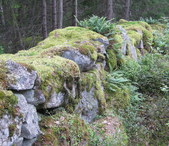 På andra sidan berghällen gömmer sig muren åter under mossa och blåbärsris.
