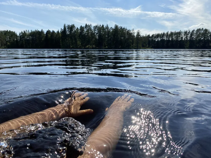 Snart var vi framme vid tjärnen, och projekt sätta upp tält startade. Det kan vara en utmaning i sig med så många involverade individer, men till slut stod det uppställt och vi bytte om till dagens bad. I Klosstjärn. Det bruna humusrika vattnet gav huden en kaffebrun färg när vi tog några simtag, och väl uppe hade små partiklar smetat av sig på huden. Lätt avtorkade, och rätt uppfriskande ändå. (Kanske ska tillägga att vi har en utmaning - att bada ute i en sjö, å eller liknande varje dag under sommarlovet, så det här var minsann inte bara ett vanligt bad, det är rent och skärt allvar :-) )