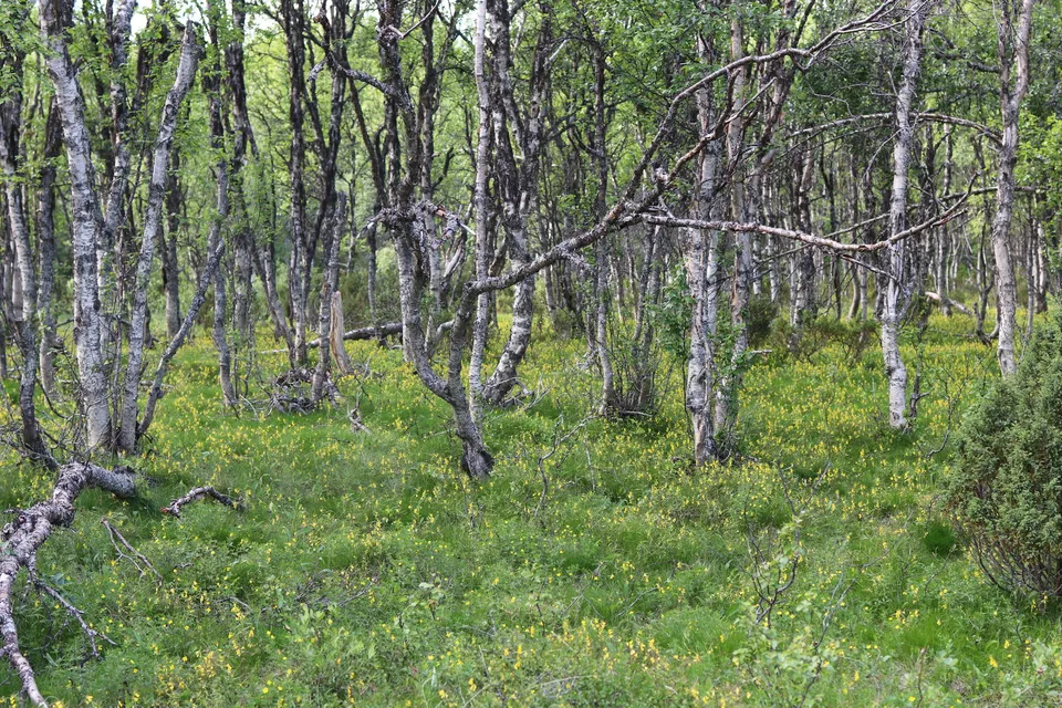 Ensam. Det kändes tråkigt att lämna familjen och en febersjuk son i lägenheten, men också skönt med en tur helt själv. I semestertidens mycket mer nära boende och liv är det ännu viktigare att också skapa utrymme för det egna. Speciellt om det är där man hämtar kraft. Turen började över Ljusnan på den gamla bron och in på pilgrimsleden - Romboleden. Genom fjällbjörkskog, enbuskar, guldgul Kovall och det där närmast självlysande gröna gräset. En av fjällens varma dagar visade det sig bli och yllet åkte snabbt av och ned i väskan. Känslan i bröstet var stor, och fri.
