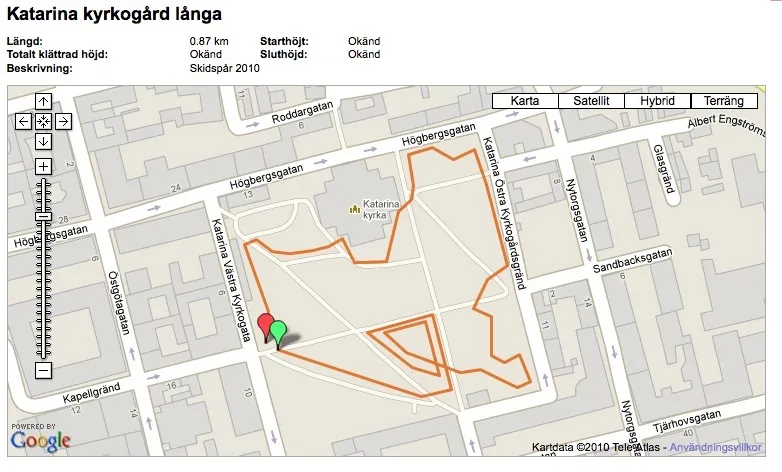 Har precis fått av mig mitt Craftunderställ, tappat upp badvatten och hängt upp tvätten. Måste bara lägga upp en bild på min nya sträckning på Katarina kyrkogård. Via shapelinks hemsida har jag låtit mäta upp en skidrunda. Genom att klicka vart jag har åkt kunde jag få ut att den nya sträckningen på, vad jag kalla "Katarina kyrkogård Långa" är 0.87 km per varv.