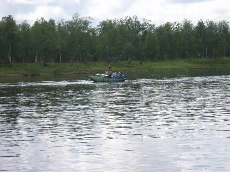 Efter en snabb lunch gjorde vi äntligen loss med våra vällastade pontoner. Vi lämnade land och rodde med bestämda roddtag ut mot de dansande strömmarna. Målet med dagen var att ta oss till renvaktarstugan ett par timmars rodd bort. Vattnet var betänkligt mycket högre än vid den förra resan längst denna sträckning (2009). Vinden friskade i, precis som den gjort under större delen av gårdagen, natten och morgonen. Det gick fort där jag gled fram bakom Tobbes ekipage, fortare än jag kunde minnas att det gjorde vid förra tillfället. Vattentrycket var mycket högre. Med spänning närmade jag mig den första kurvan på älven, kurvan där jag landade min första ädelfisk från pontonbåten 2009. Jag mindes det som i går: Jag gled fram över forsnacken, ett vak, det högg till. Jag kämpade mig genom den lilla forsen och håvade fisken efter någon minuts drillning, lyckan var total.
