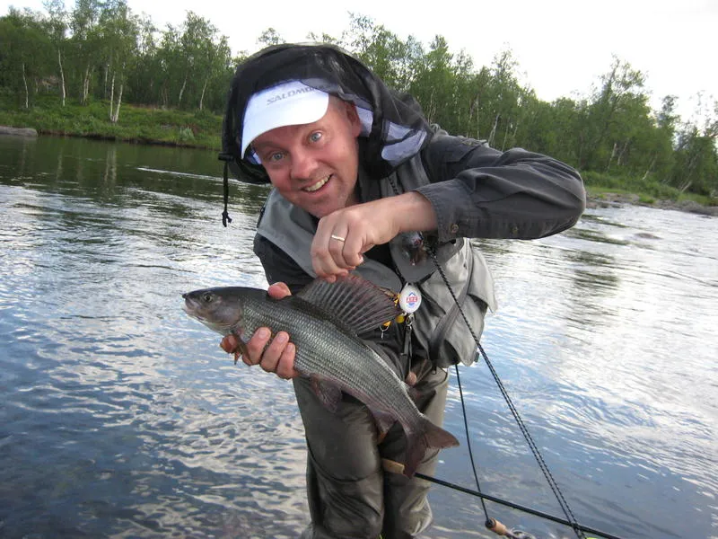 Efter förmiddagens fantastiska harrfiske med rekord efter rekord var vi framme vid platsen där vi skulle bli upplockade av en helikopter dagen efter. Pontonerna var nedmonterade och låg på myren redo för hemfärd. Kvällens fiske fick ske från land eller utvadade i strömmen. Både jag och Tobbe föredrog en rejäl sovmorgon framför stuvning av material i arla morgonstund.