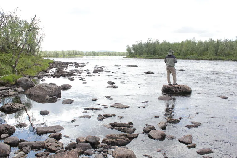 Morgonen låg där stilla och behaglig. Solen sken och det glittrade i vattnet nedan för vår tältplats. Tobbe låg fortfarande och sov. En morgon som denna, när det var hemresedag, orkade jag inte tillaga någon frukost. På stenen utanför tältet jobbade stormköket på med ett fräsande för att värma vatten till en "morgonkåsa" starkt kaffe. En näve jägarmix fick bli dagens energikick. Jag kikade ner i det klara älvvattnet från min höga position. Nere vid älvkanten kunde jag tydligt se flera skuggor röra sig över botten. Det var öringar som jagade sin frukost. De stod där nästan stilla bakom en liten sten eller grop, med små rörelser höll de sig kvar. Plötsligt och gjorde de små utfall, simmade framåt, gick upp till ytan och tog något för att omgående glida tillbaks till sin ståndplats. Det var en fantastisk syn. Att uppifrån, med en kopp varmt kaffe, få sitta och följa naturens skådespel gjorde mig gott. Jag satt kvar i solskenet och njöt. Efter en stund gjorde jag i ordning mitt flugspö och hasade mig ner för slänten till vattnet. Väl nere kunde jag konstatera att det skulle bli svårt att nå fiskarna med linan. Träden bakom mig var i vägen. Mina vadarbyxor och skor var redan nedstuvade i en väska vilket håll mig till ett alternativ, på land. Jag gjorde ett flertal försök men skrämde istället iväg fiskarna.