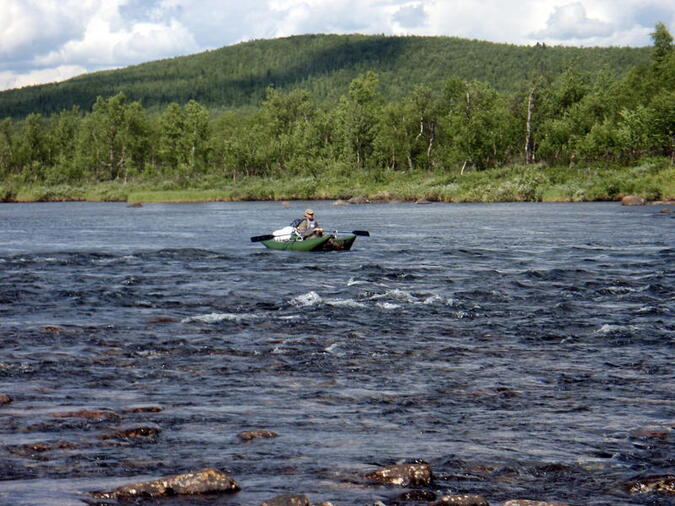 Pontonerna visade sig vara hur stabila som helst. Vi hade stuvat undan flugspöna bakom oss för att till en början ta oss nedströms helt fokuserade på älven. Redan från början gick rodden som en dans. Jag gled ovanpå forsen. Snart var jag ute på flatstryket som kommer efter enfors. Stenarna på botten försvann under mej i det klara vattnet där jag sköts fram. Det tog inte många sekunder innan jag började pilla på flugspöt. Jag drog ut lite lina och knyckte med handleden ett par gånger. Flugan landade och låg fint på ytan, den flöt i samma takt som jag och min ponton. Vi flöt förbi platsen där vi kvällen innan tagit fisk med hjälp av Holländarna. De hade brutit upp sitt läger och flugit hem med helikoptern på morgonen, de hade vi hört. På fötterna hade jag simfötter. Genom att använda dessa i vattnet kunde jag stoppa upp tempot något. Det var bara att köra med lite bensparkar så kunda jag både styra och förflytta mig utan att behöva släppa spöt. Jag kunde sturnta i att använda årorna. Ljudet av en ny brusande fors mötte mig. Jag gled fort. Långt framför mig kunde jag se hur Tobbe hade tagit in sin lina och nu rodde in i strömfåran. Jag hade precis bestämt mig för att göra det samma när det vakade ett par meter nedströms min fluga. Flugan låg perfekt, som ett stritsflygplan som gick in för landning på ett hangarfartyg. Jag omvärderade mitt beslut om att ta hem linan och lät flugan glida vidare...