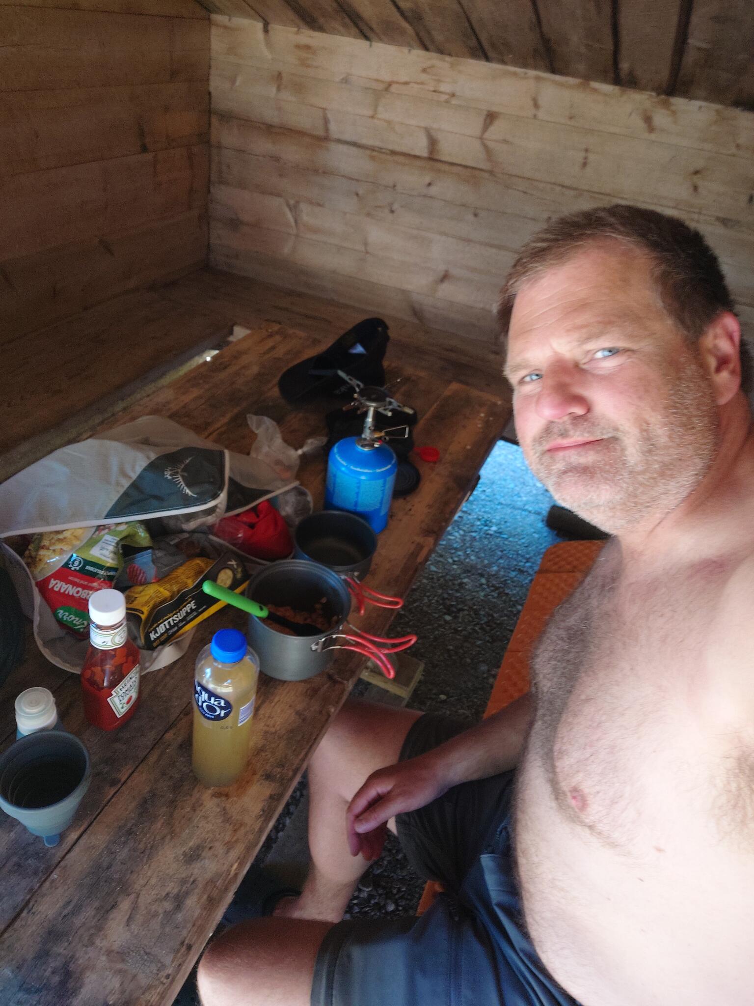 Fortsatte sedan på den väldigt lättvandrade sträckan som följde exakt samma spår som skidspåret på vintern. Tog lunch i Eldris i en slogbod för att komma undan solen. Blev kvar där länge eftersom det var så lätt vandrat så hade jag ingen brådska alls
