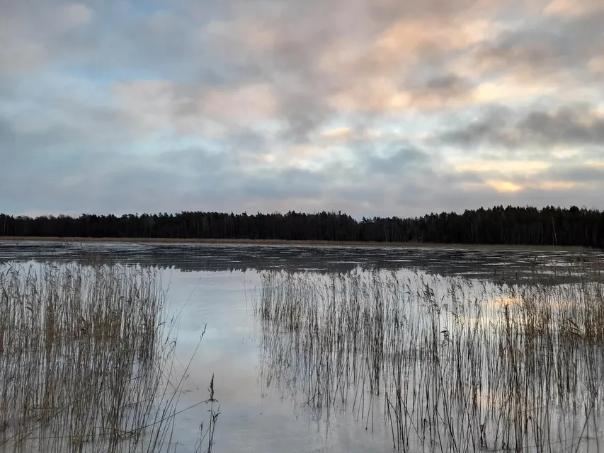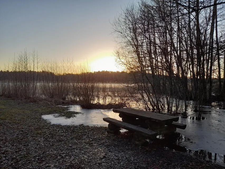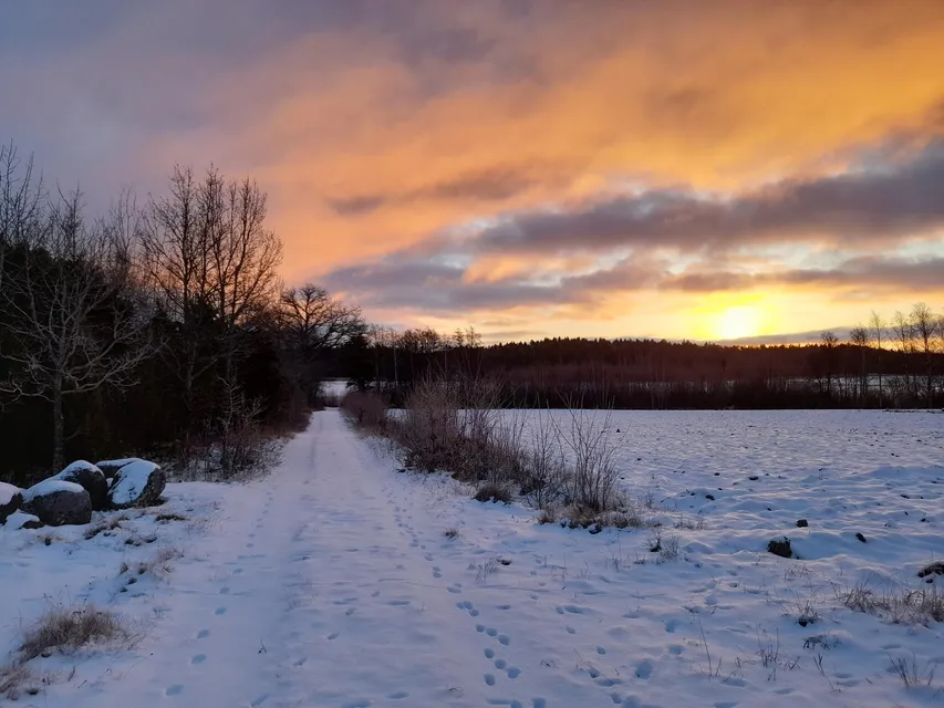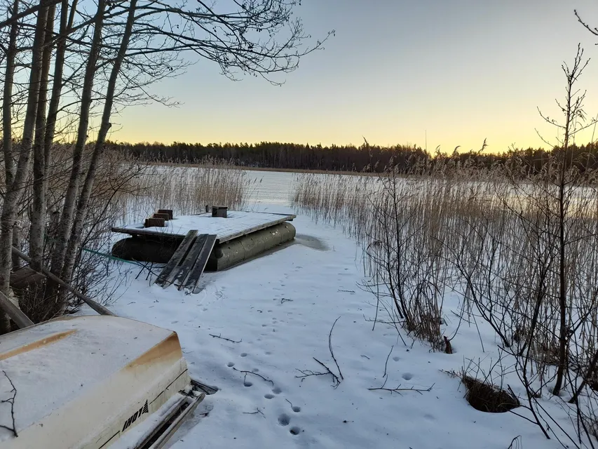 Jag kommer hit i soluppgången. Inga mänskliga spår leder ned till träsket. Korp och björktrast hörs. Det är mycket björktrast kring Byträsk. De chansade kanske rätt när de valde att övervintra i år. Sätter mig på den lilla flotten vid stranden. Tittar ut över isen på träsket. Det är en fin och lugn januarimorgon. Några minusgrader. En gulsparv "chirpar" i norr. Gärdsmygen smattrar till bakom mig. Kråkor, skator och nötskrikor hörs på flera håll. Några kajor flyger över. Borta i söder tecknar solen en stor flik av himlen över trädtopparna ljust gyllengul. Men av solen ser jag inget. Svaga läten av flygande domherre, talgoxe och den tjattrande björktrastflocken. Vinterljud.
