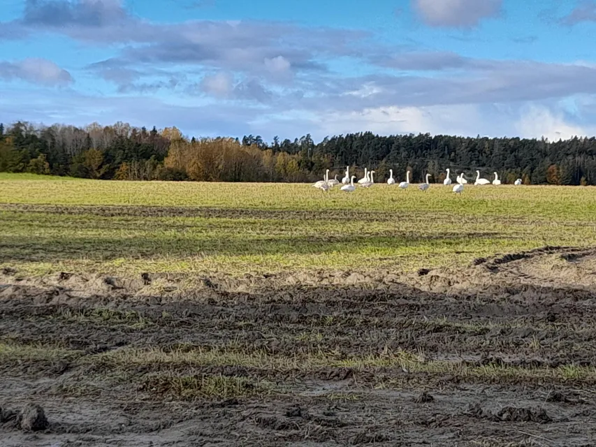 Jag kommer till träsket vid lunchtid. På åkrarna västerom ett fyrtiotal sångsvanar och kanske det dubbla kanadagäss. En grågås såg jag också i flocken. Två kråkor jagade en sparvhök. Vid Byträsk är det lugnt. Vassen helt brunfärgad; får se om den lyckas stå upp året ut. De sista lärkorna hörs flytta över träsket. Jag sitter som en kung här på flotten. Har höstlov och tar dagen som den kommer. En korp hörs i öster. Solen bryter fram bakom molnen, och värmer fortfarande skönt. Hackspett, kråka och blåmes hörs. Flyttande ängspiplärka. Dunkavledun svävar omkring i luften och lägger sig på den blanka vattenytan. En nötskrika skränar långtbortifrån. Den har säkert planterat nötterna som den hade i krävan. Två rödhakar börjar knäppa bakom mig. Undrar vad de pratar om.