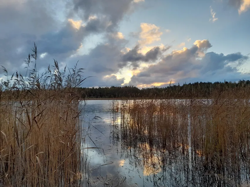 Det blåser hårt från nordväst, men här nere vid träsket är jag i skydd för vinden. Sångsvanarna ropar från åkrarna i väster. Jag såg något som kunde vara sångsvansfamiljen som häckade i träsket, stå lite för sig själva, tre ungfåglar och två föräldrar, som om de inte riktigt hörde till. Femtiotalet kanadagäss var också ute och flög i motvinden. Bonden är mitt upp i höstplöjningen och det lockar till sig måsfåglar. En gammal havsörn svävar nu över skogskanten vid andra stranden. Ett par korpar flyger förbi den, men låter den vara. En gräsand kväker i vassen bredvid mig, så att jag hoppar till. Vädret är nyckfullt. Det kommer en kort regnskur. Flotten rör sig i stormen och det blåser ned allöv på mig. Blåmesar i vassen. En trastflock och en knipflock drar förbi. En fiskmås kommer nära på en flygtur. Havsörnen fortsätter kretsa över träsket. Den gillar att vara ute i hårt väder. När jag gick hem såg jag en varfågel sitta och spana i en björktopp vid traktorvägen ned till träsket. Det är inte varje år man ser den.