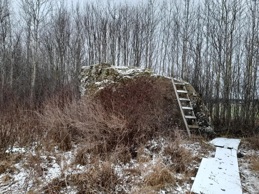 Det känns välkomnande att markägaren byggt en stege upp till den stora stenen som ligger bara hundra meter väster om träsket. Jag klättrar upp på stenen. Framför mig söderut har jag fin utsikt över åkrarna, till vänster ser jag Byträsk skymta mellan alarna. Bakom mig har jag de vida åkrarna uppemot Östergeta by. Det är en gråmulen dag med vind och snöfall från norr. Någon plusgrad. Skönt att nu ha januari bakom sig. En gärdsmyg kilade omkring i diket som en mus när jag kom hit längs vägen. Snöfallet tilltar där jag sitter och försvårar möjligheten att se och höra fåglar. Kanske att februari tar sitt ansvar och ger oss den vinter vi ännu inte haft. En talgoxes lockläte är det enda jag hör. En blåmes svarar. Snöfallet upphör igen. Fyra björktrastar passerar tjattrande från öster till väster. En korp kraxar till i väster, en kråka. Och så tuppen som ropar god morgon inifrån byn.