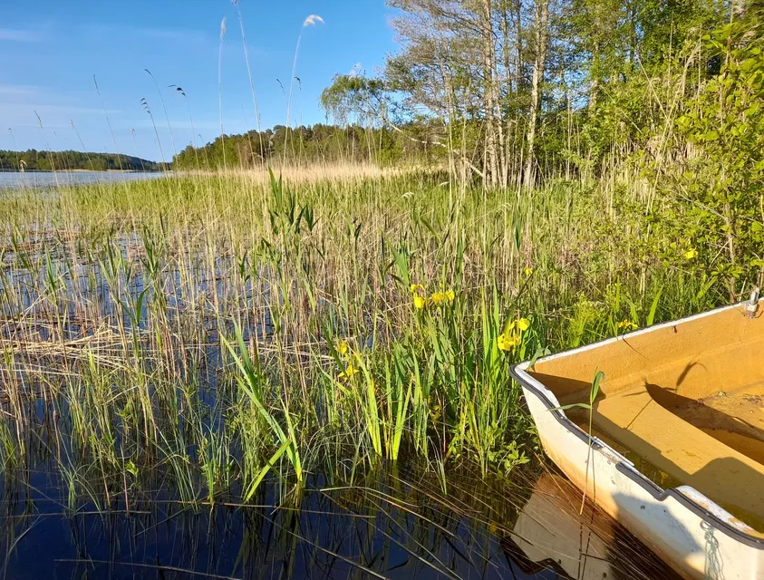 Kommer ned hit vid halvsjutiden på morgonen. Det är en lugn och solig junimorgon. Solen värmer där jag sitter och näktergal, bofink, svarthätta och koltrast står för underhållningen. Vassen har börjat växa nu och dessutom svärdsliljorna. Lommen kommer in för landning efter en flygtur. Den planar fram platt på magen mitt på träsket. Den andra lommen kommer simmandes till mötes från träskets norra sida, och utstöter ett knorrande ljud, och sedan, innan den dyker, ett högt rop. Det här upprepas tre gånger. Det är kanske någon form av hälsningsritual? Till slut simmar de alldeles bredvid varandra, samtidigt som de doppar huvudena under vattenytan. Rörsångaren vaknar i vassen på andra sidan träsket och drar någon strof. Gransångaren "tjiffar" på bredvid mig och en tärna flyger iväg bort från träsket med en fisk i näbben. Tre vigghonor flyger vilset omkring. Trastsångaren börjar sjunga i norra vassen. Getingar och sländor har bosatt sig i den lilla båten som ligger uppdragen vid stranden och säkert används till kräftfiske. Det är tydligt att någon brukar komma hit varje vecka. Gräset runt träbänken är klippt. Nu är lommarna plötsligt tre och jag förstår absolut ingenting! De simmar tätt tätt tillsammans. Kan det vara att ungen redan är lika stor som föräldrarna och ser exakt likadan ut?