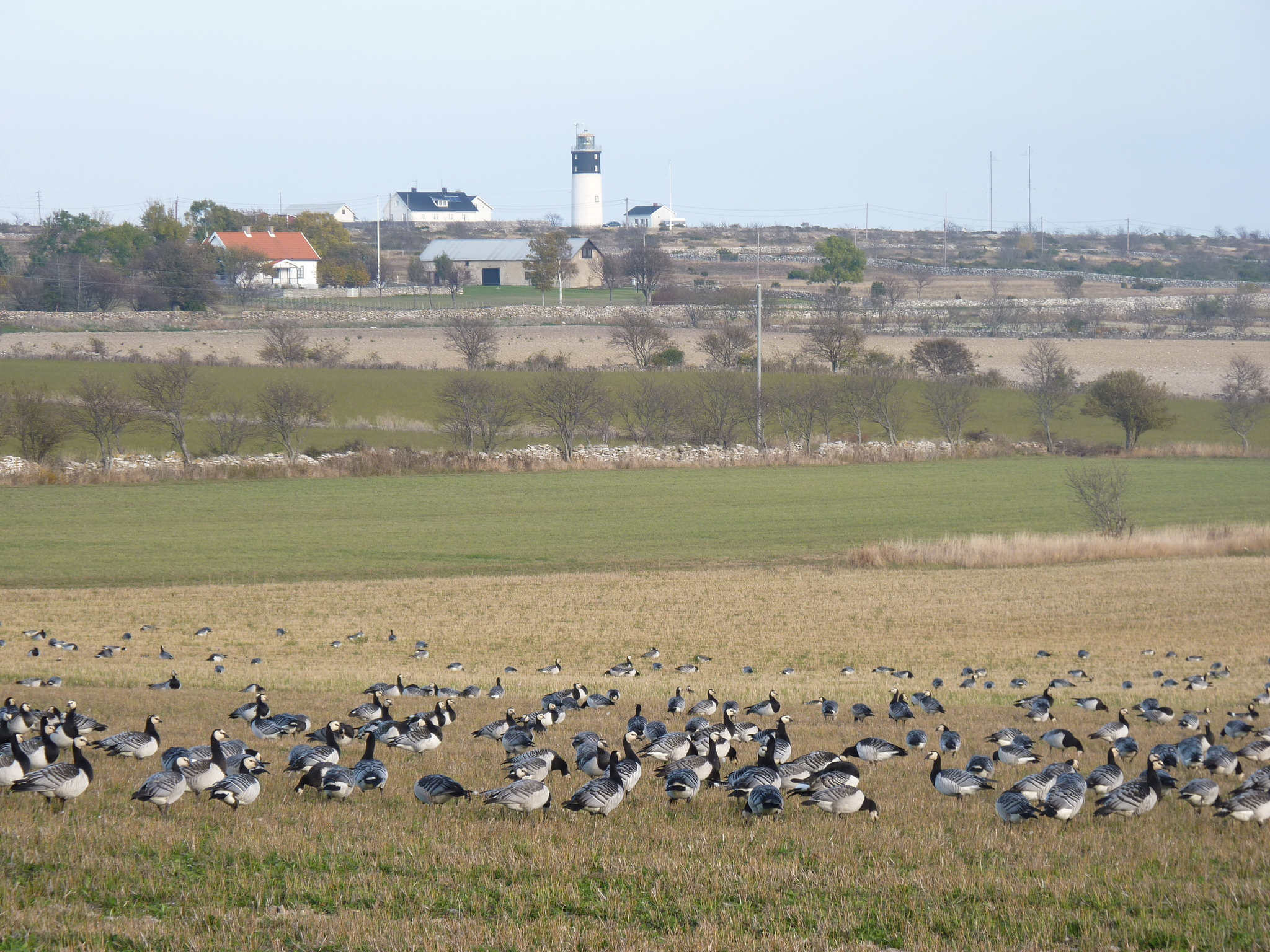 Nedanför berget betade Vitkindade gäss på väg upp till norra ishavet. Hoburgens fyr i bakgrunden.